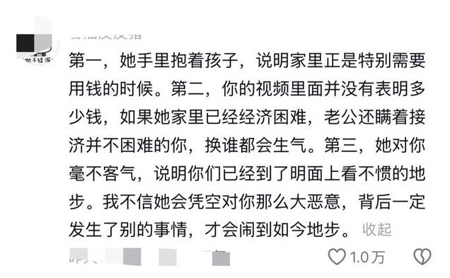 看到嫂子手里抱着孩子,说明家里需要用钱,再就是老公背着给钱,她是不知道的,但是肯定家里有困难她才会翻脸的,