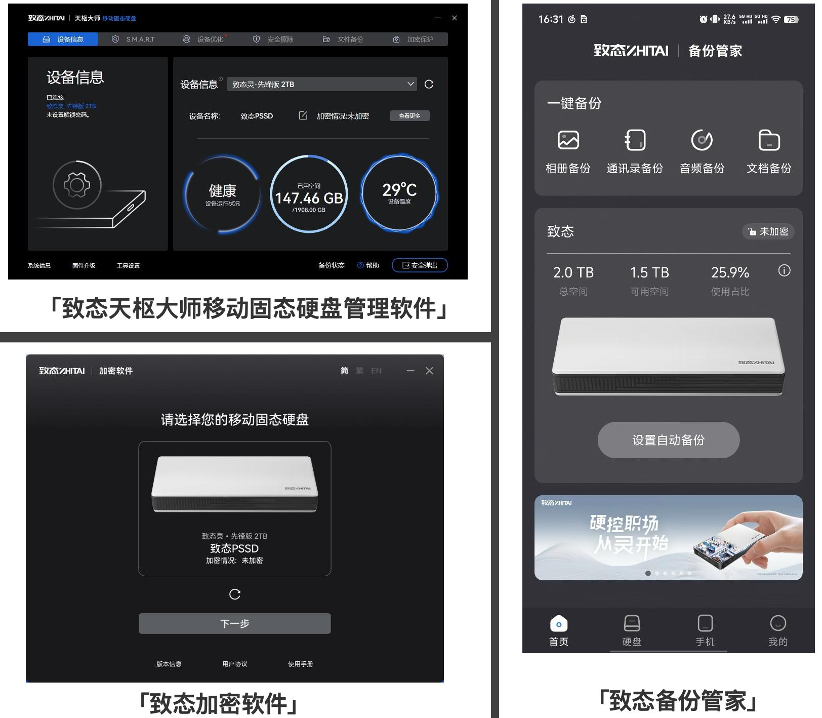 软件方面:致态灵配备了致态天枢大师移动固态硬盘管理软件、致态备份管家以及致态加密软件,可实时监控移动固态硬盘健康状况、一键备份数据并加密,确保数据安全。