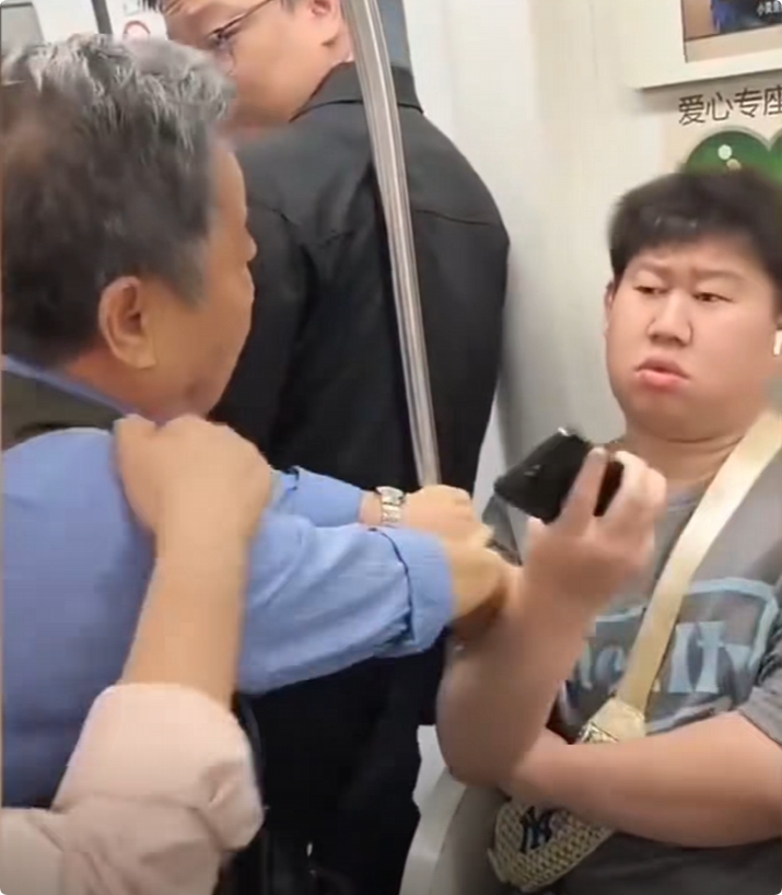 时间一分一秒地过去,老人的耐心显然已耗尽。他开始提高音量,用一种命令式的语气要求:“年轻人,让一下,这是老人的座位!”这一刻,旁边的乘客们纷纷掏出手机,准备记录下这场戏剧化的冲突。有人试图劝解,然而老人愈发激动,甚至抓住了小伙的手臂,显得格外坚决。
