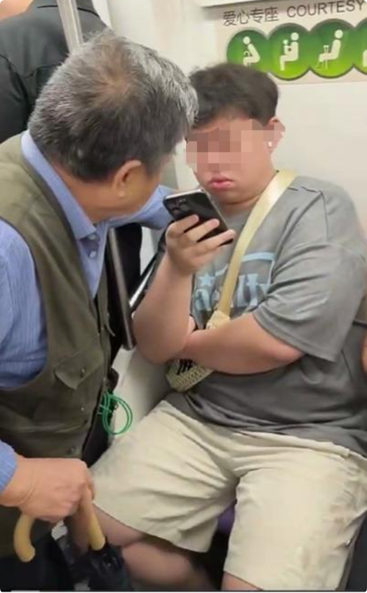 对面,一位看起来约有83岁的老人情绪激动,试图通过轻拍小伙的手臂引起他的注意。老人的请求很简单,能否让个座。小伙没有反应,完全无视了老人的存在。