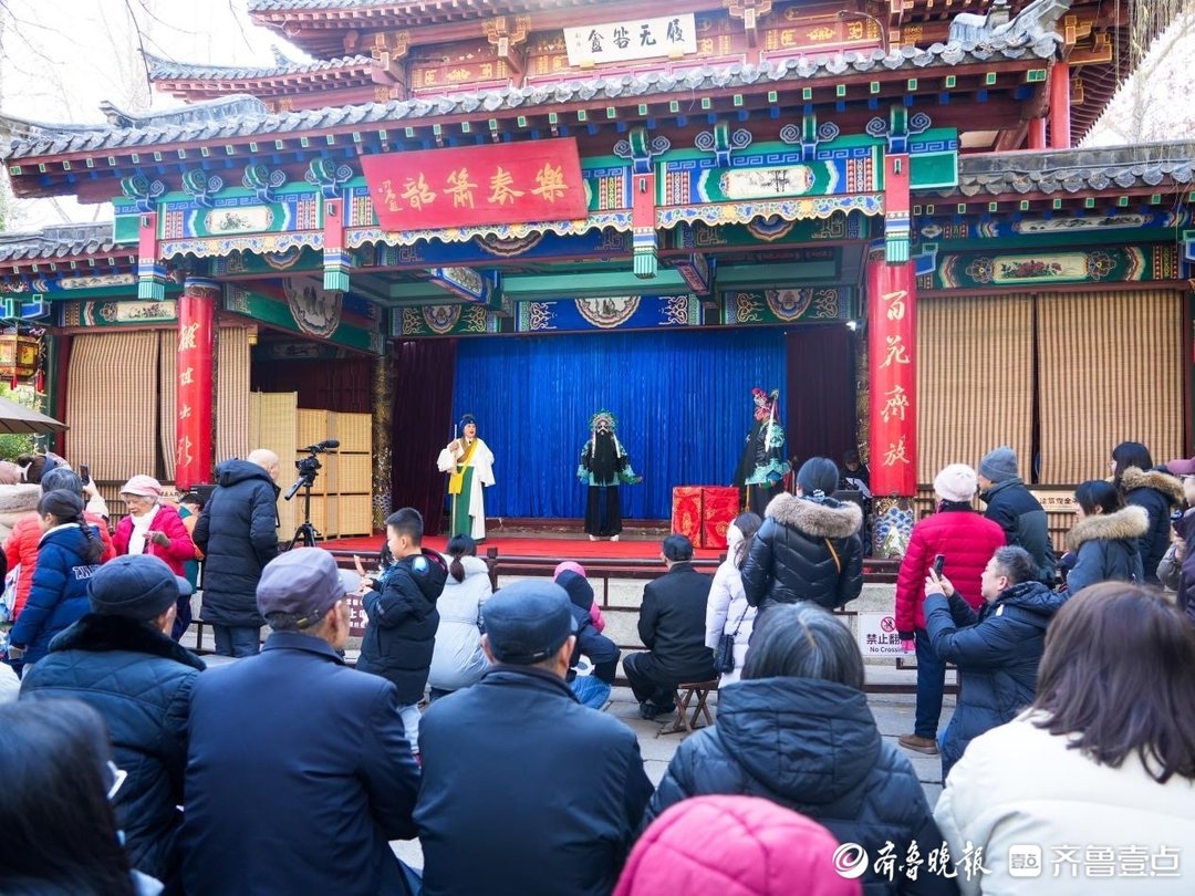 趵突泉白雪楼戏台更是热闹非凡,元旦期间,每天都有原汁原味的戏曲表演在这里上演。《霸王别姬》《遇皇后》《游龙戏凤》《红灯记》《锁麟囊》等经典戏曲名段轮番登场,赢得现场观众阵阵掌声。齐鲁大地的曲艺文化与生机勃勃的千年泉水在这里巧妙融合,碰撞出独特的文化魅力。