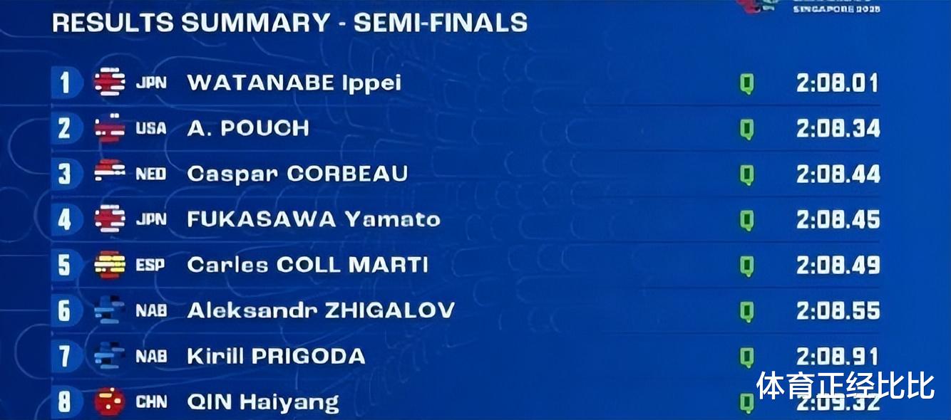 在去年巴黎奥运会个人项目中,秦海洋100米蛙泳决赛游出59秒50获得第7名,200米蛙泳半决赛游出2分09秒96获得第10名无缘决赛,可谓是成绩惨淡
