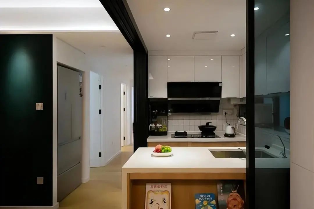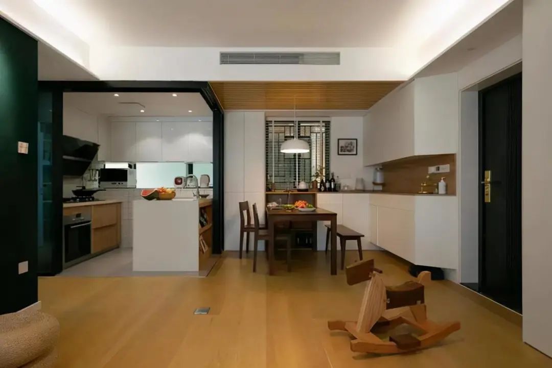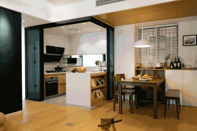 厨房与餐厅相互邻接,在设计师的精巧构思下,两侧的非承重墙被拆除,取而代之的是玻璃推拉门。这一改动不仅让空间更加通透,提升了室内的采光效果,而且确保了厨房与餐厅的独立性,使得两个区域在保持联系的同时,也各自保留了其特有的功能与氛围。这一设计手法巧妙融合了开放与私密,打造出了一种别样的生活体验。