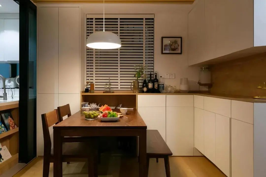 餐厅采用了L型收纳柜的设计,结合了高柜与低柜的优点。