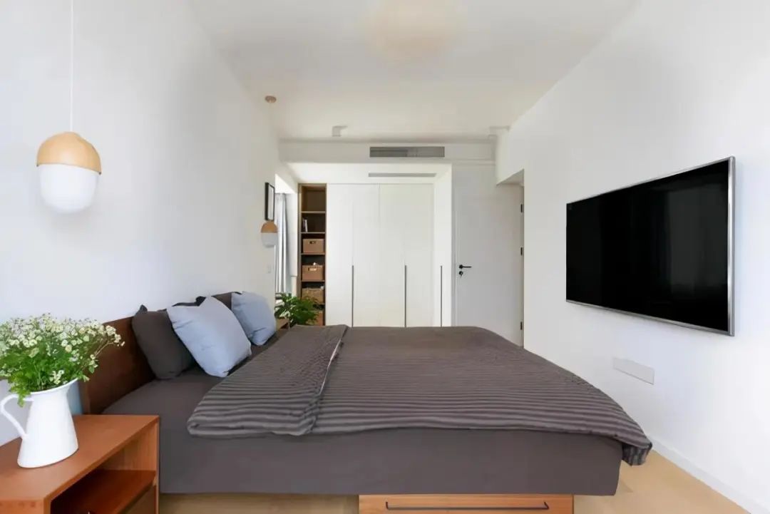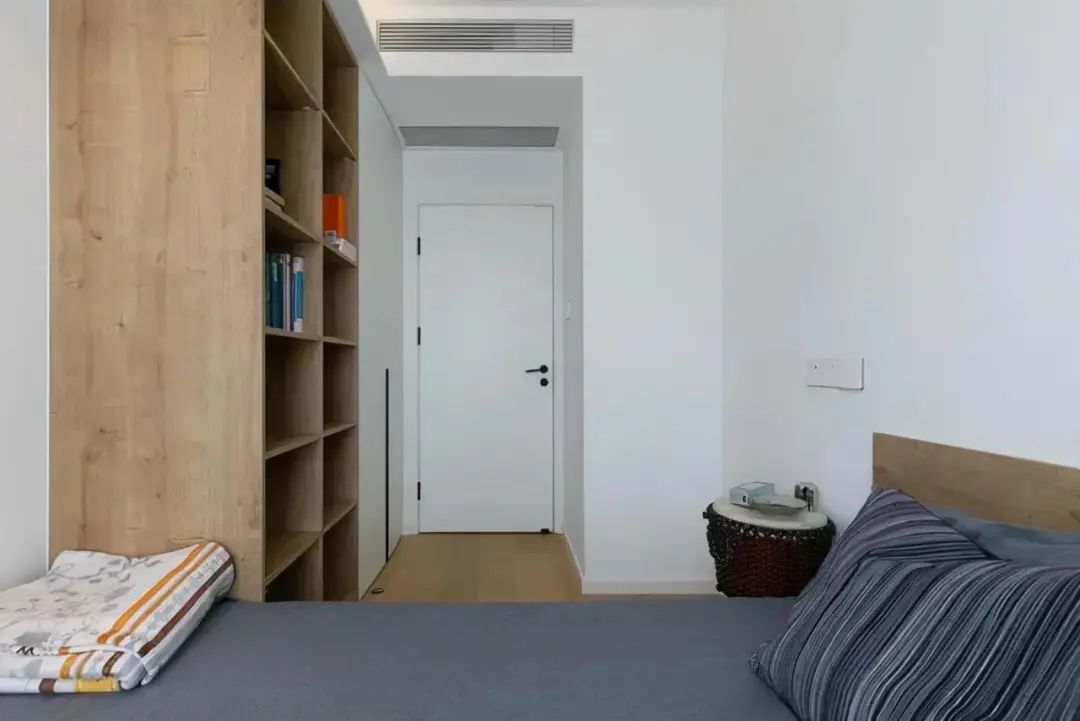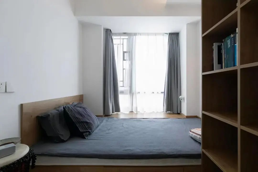 次卧采用了经典的榻榻米设计,这一布局不仅充分利用了空间,还巧妙地融入了飘窗元素。这样的设计集成了床、衣柜、书柜的多重功能,既实用又富有创意。靠近卧室入口的位置,设计师放置了白色衣柜,其顶天立地的设计不仅提供了充足的储物空间,而且最大限度地提高了空间利用率。