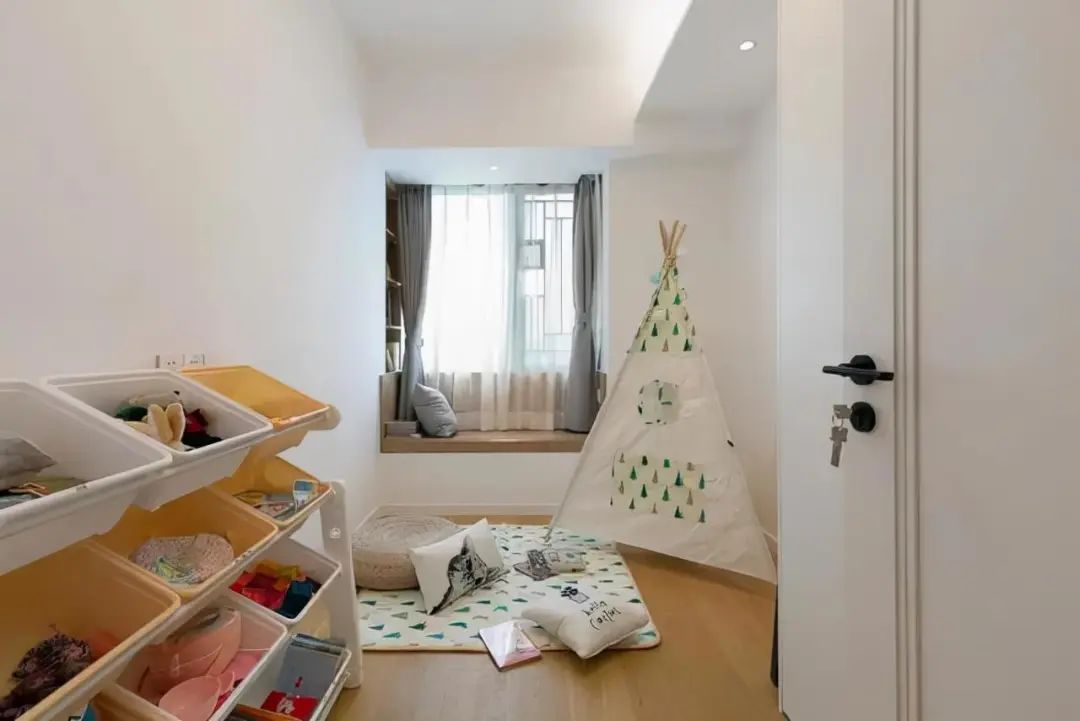 另一间次卧最初的设计计划是打造榻榻米风格,但在综合考虑成本因素后,决定暂时放弃这一方案。目前,该房间已被房子的主人改造为婴儿玩耍的娱乐室,满足了家中的实际需求。设计上的灵活性使得这个房间具备多重功能的可能性。未来,随着家庭需求的变化,可以轻松调整房间的内部布局,使其适应新的用途。这种设计思路体现了实用性与可变性的结合,让家居空间更加灵活适应生活的变化。