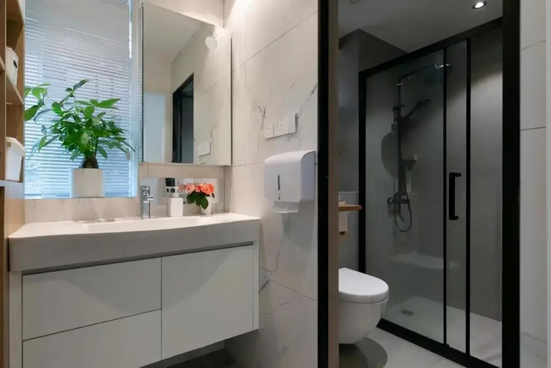 浴室的内饰配色采用了黑色和灰色的经典组合,营造出一种现代而高雅的氛围。黑框玻璃作为隔断巧妙地划分了空间,不仅保证了功能的独立性,还给整体视觉效果增添了干净清爽的感受。此外,设计师选择了壁挂式马桶设计,这种创新布局不仅节省了空间,更有效地减少了卫生死角,提升了清洁便利性。这种设计细节体现了对用户体验的细致关怀,让浴室空间更加舒适、实用且易于维护。