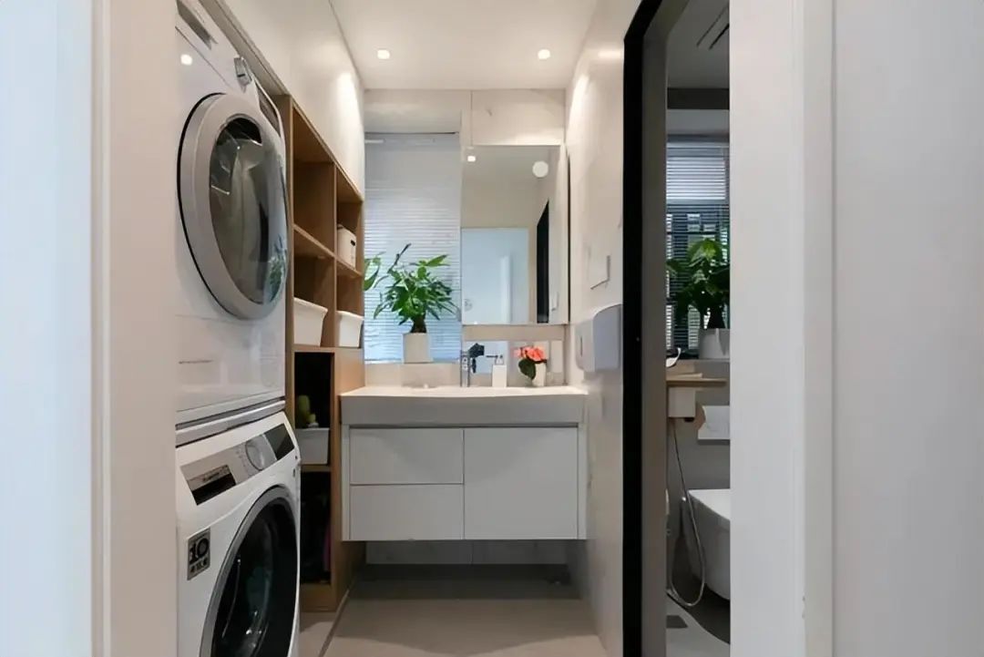 为了缓解卫生间的使用压力,设计师精心构思了一种双重分隔设计。洗漱台被向外移动,从而实现了干湿分区,确保了卫生间在不同功能区域之间的舒适性和实用性。此外,储物柜被定制在洗漱台的左侧,这一设计巧妙地满足了收纳需求,让空间利用更加高效。同时,洗衣机和烘干机也被完美地嵌入到储物柜中。这样的布局不仅节省了空间,还让整个卫生间看起来更加整洁统一。这种综合考量的设计,既提升了卫生间的功能性,又彰显了现代家居设计的精致与人性化。