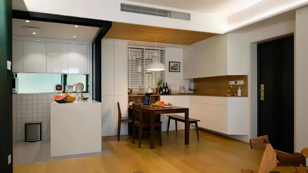 当你需要换鞋时,可以直接坐在长椅上,这一设计考虑无疑大大提升了日常生活的便捷性。同时,厨房与餐厅之间的隔墙被拆除后,这一改动不仅使得厨房区域显得更为宽敞,还显著提高了整体的采光率。室内因此更加明亮通透,居住体验也得到了极大的提升。