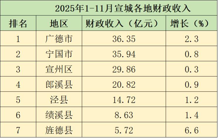 宣州区(29.86亿)和郎溪县(20.82亿)两地财政收入均在20亿级别。宣州区1-11月财政收入同比增加0.2%,总量居全市第三位,总量接近了三十亿大关。宣州要加快财政增速,从而尽快实现财政总量的突破。