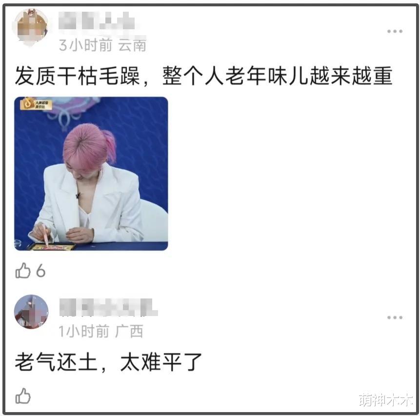 众所周知,粉色并不是好驾驭的颜色,这般娇嫩的颜色很容易暴露年龄感。直播中,当赵丽颖低头写写画画的时候,她的粉发直面镜头,大家会发现她的发质并不好,干枯毛躁,甚至被网友嘲讽整个人老年味越来越重。