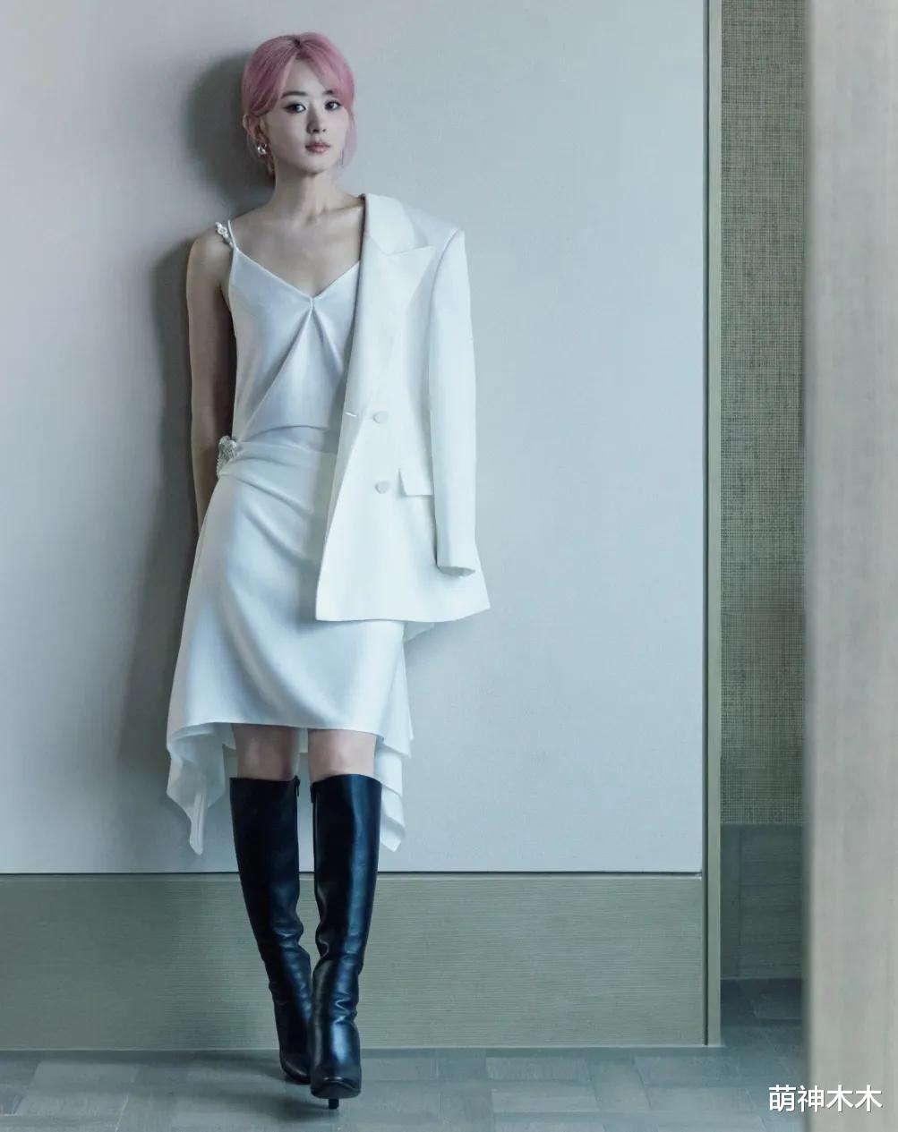 从工作室分享的照片中可以看到,赵丽颖身穿简约干练的白色西装,内搭白色吊带裙,脚上穿着一双黑色长筒靴。发型方面,她原本干净利落的短发被盘在脑后,主打一个优雅。妆容方面,为了和她的粉发相呼应,她的眼影、腮红和口红都选择了粉色系。