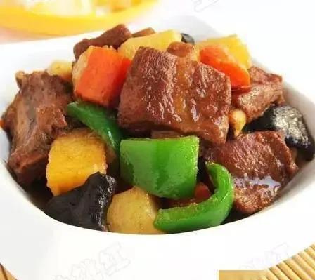 6、放入土豆、香菇和胡萝卜块,加入盐调味,继续炖至土豆变软,胡萝卜软熟7.最后临出锅前加入青椒片翻炒几下就可以了。