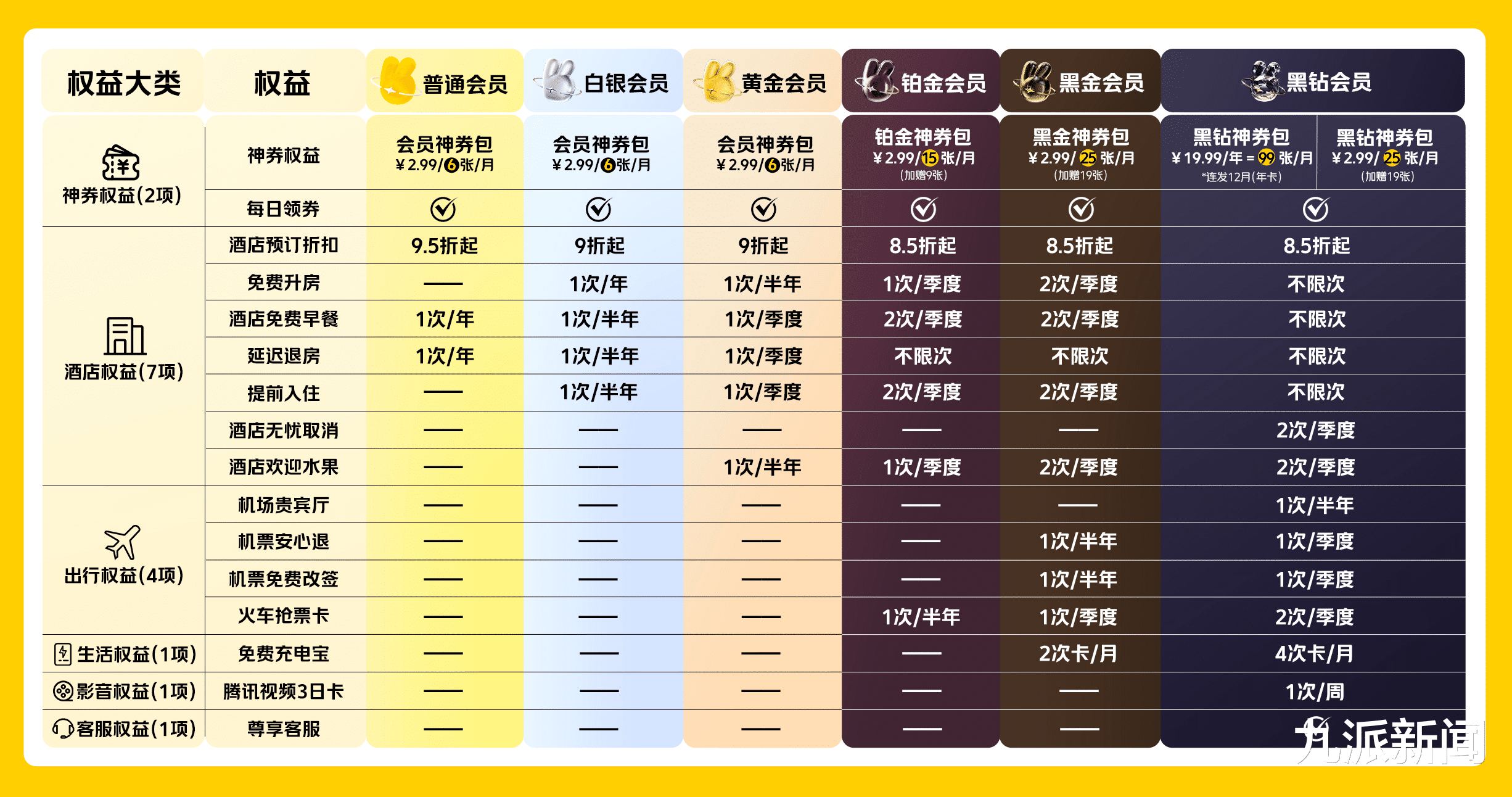 据了解,一期权益主要包括“神券”权益、酒店权益(免费升房、免费早餐、折扣预订)、出行权益(机场贵宾厅、机票退改礼包、火车抢票卡)、生活权益(免费充电宝、影音VIP)等。其中,美团黑钻会员更是尊享19.9元购买“神券”年卡、无限次酒店免费升房及免费早餐、专属客服等一系列重磅权益。