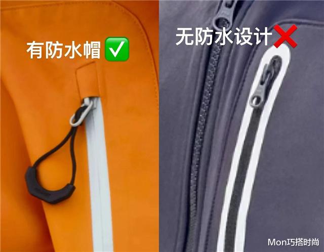 要用冲锋衣打造出“老钱风范”,咱们得从细节抓起。冲锋衣嘛,防水是基本要求,但你知道吗?拉链的防水设计才是检验它是否专业的关键!如果拉链没有防水帽,说明质量设计不过关,再好看也别选!