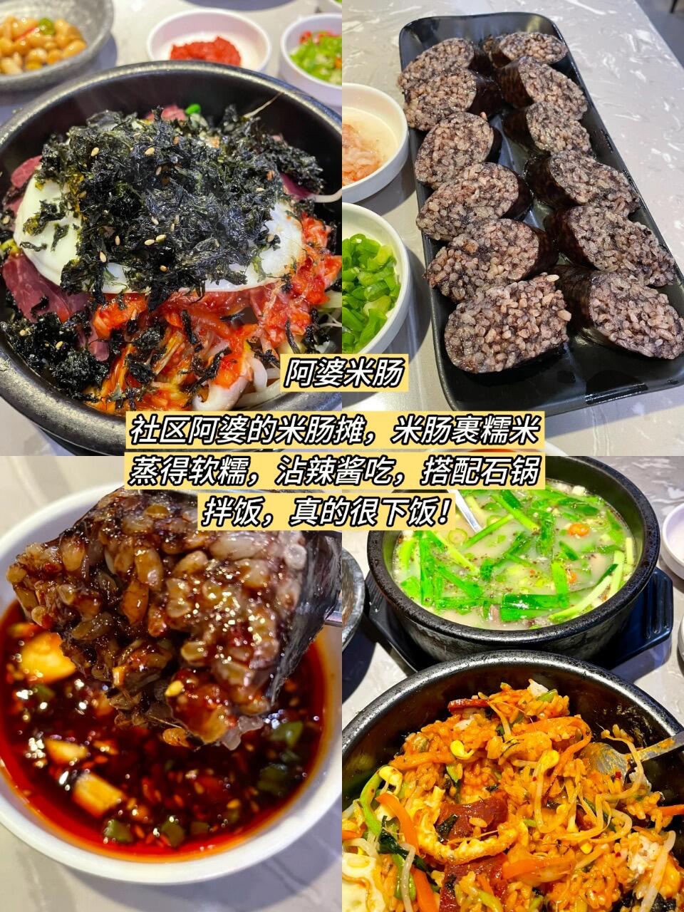 社区阿婆的米肠摊,米肠裹糯米蒸得软糯,沾辣酱吃,搭配石锅拌饭,真的很下饭!🍚