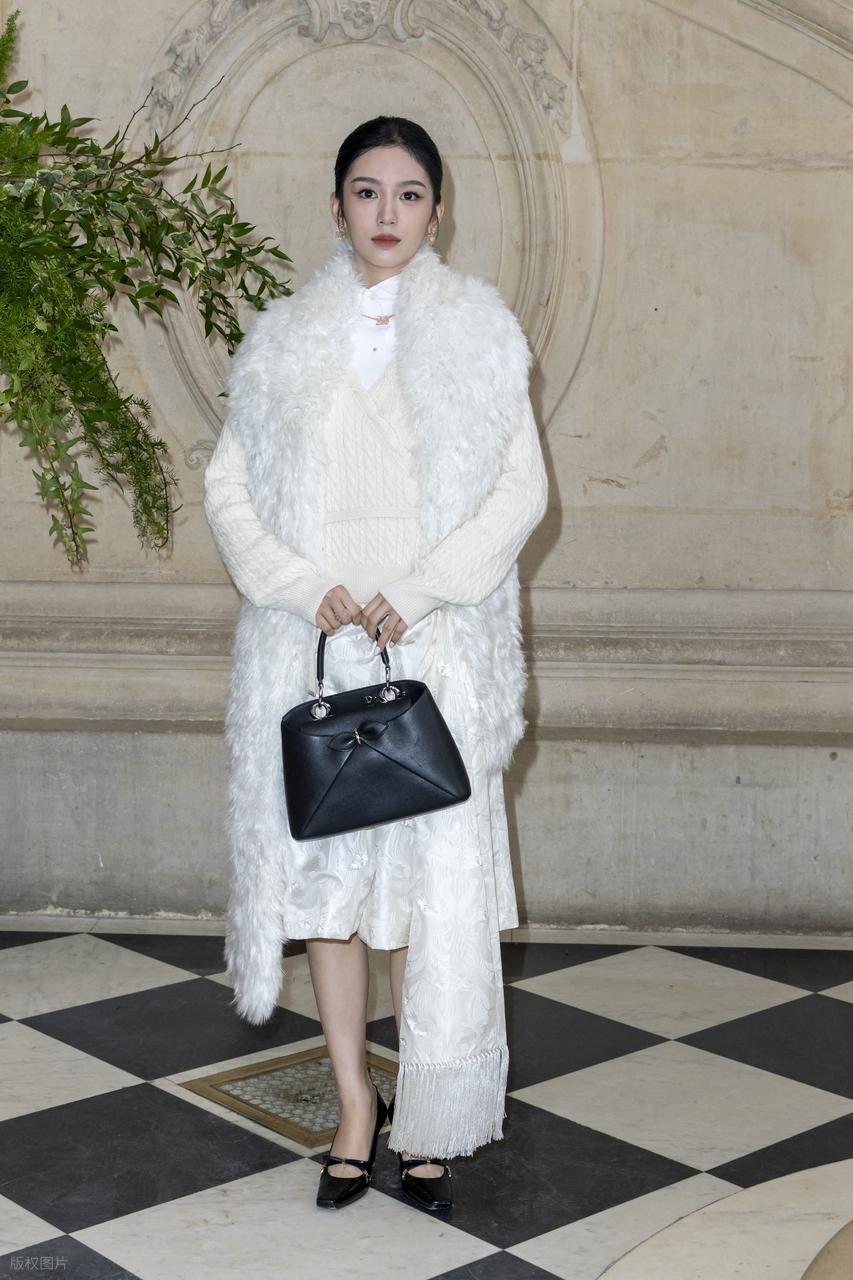 周也以 Dior 品牌大使身份亮相巴黎 2026 春夏高级定制大秀,作为新任创意总监首秀的核心嘉宾,她的造型惊艳全场。一袭纯白高定针织套装搭配毛绒披肩,全露额 “大光明” 盘发勾勒出教科书级骨相,高颅顶、流畅下颌线在生图中依旧抗打,冷白肌肤与白裙相融,被外媒盛赞为 “凝霜带雪的白玫瑰”。