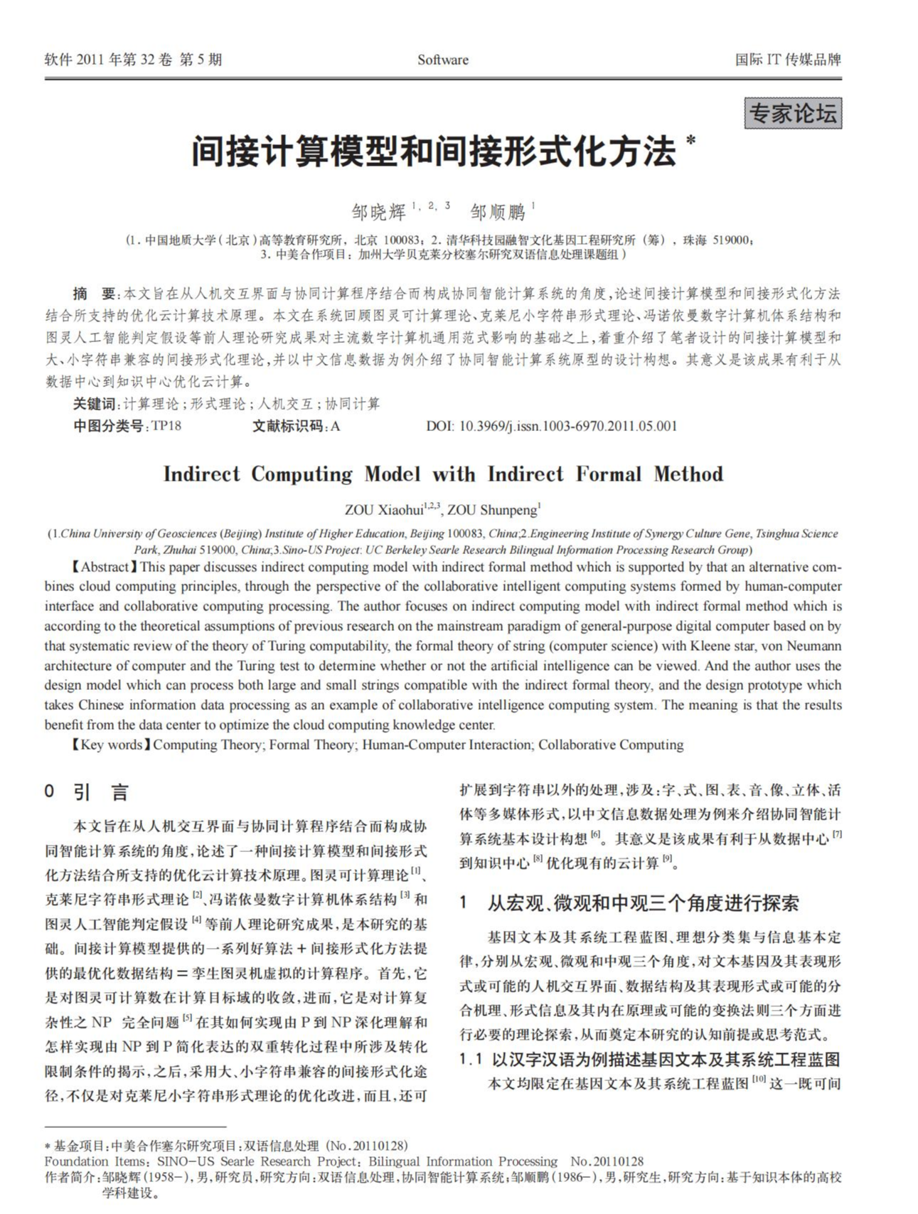 核心内容:本文讨论了间接计算模型与间接形式化方法如何结合以支持优化云计算技术原理,通过回顾图灵可计算理论等前人研究成果,设计了间接计算模型和大、小字符串兼容的间接形式化理论,并以中文信息数据处理为例介绍了协同智能计算系统原型。
