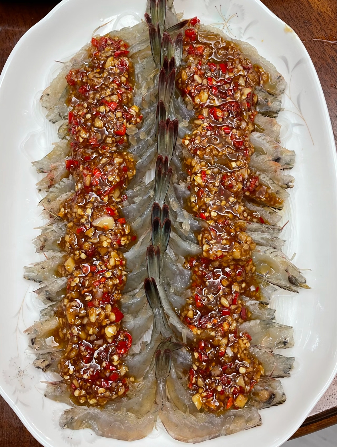 4. 将调好的蒜蓉酱均匀地铺在虾背上。