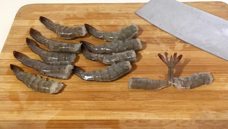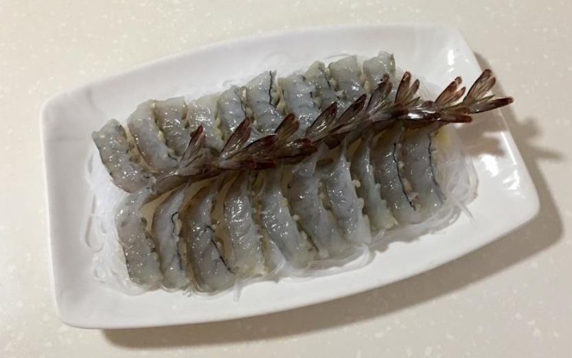 2. 大虾剪去虾须和虾头,从背部片开并去除虾线,处理好后摆放在粉丝上。