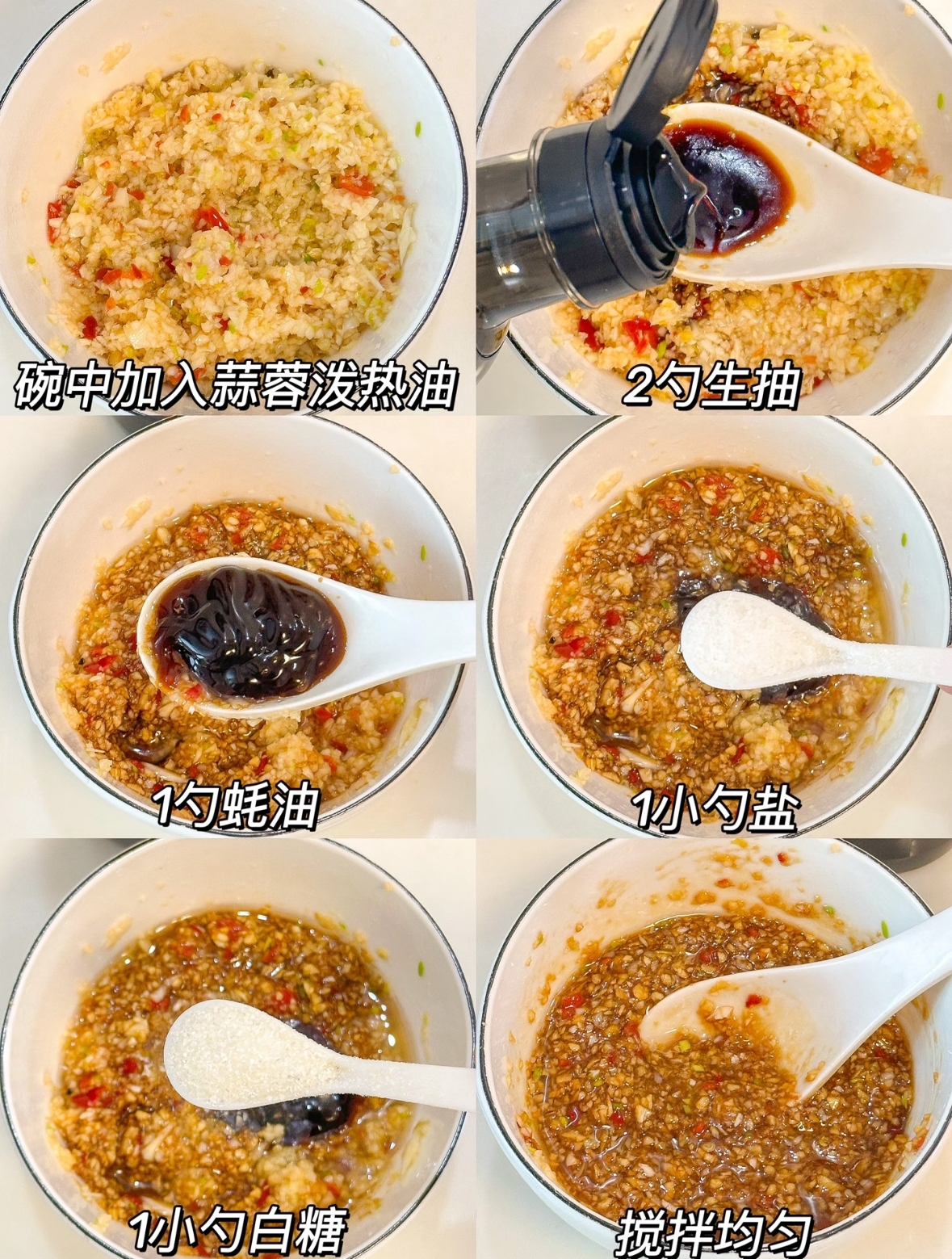 3. 大蒜和小米辣分别剁成沫放入碗里,锅中倒入适量食用油加热后淋入碗中,再调入生抽2勺、蚝油1勺、盐适量、白糖1小勺,搅拌均匀制成蒜蓉酱。