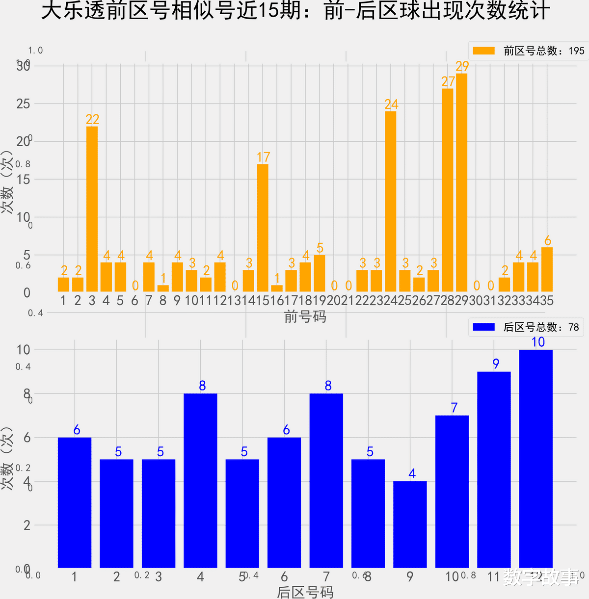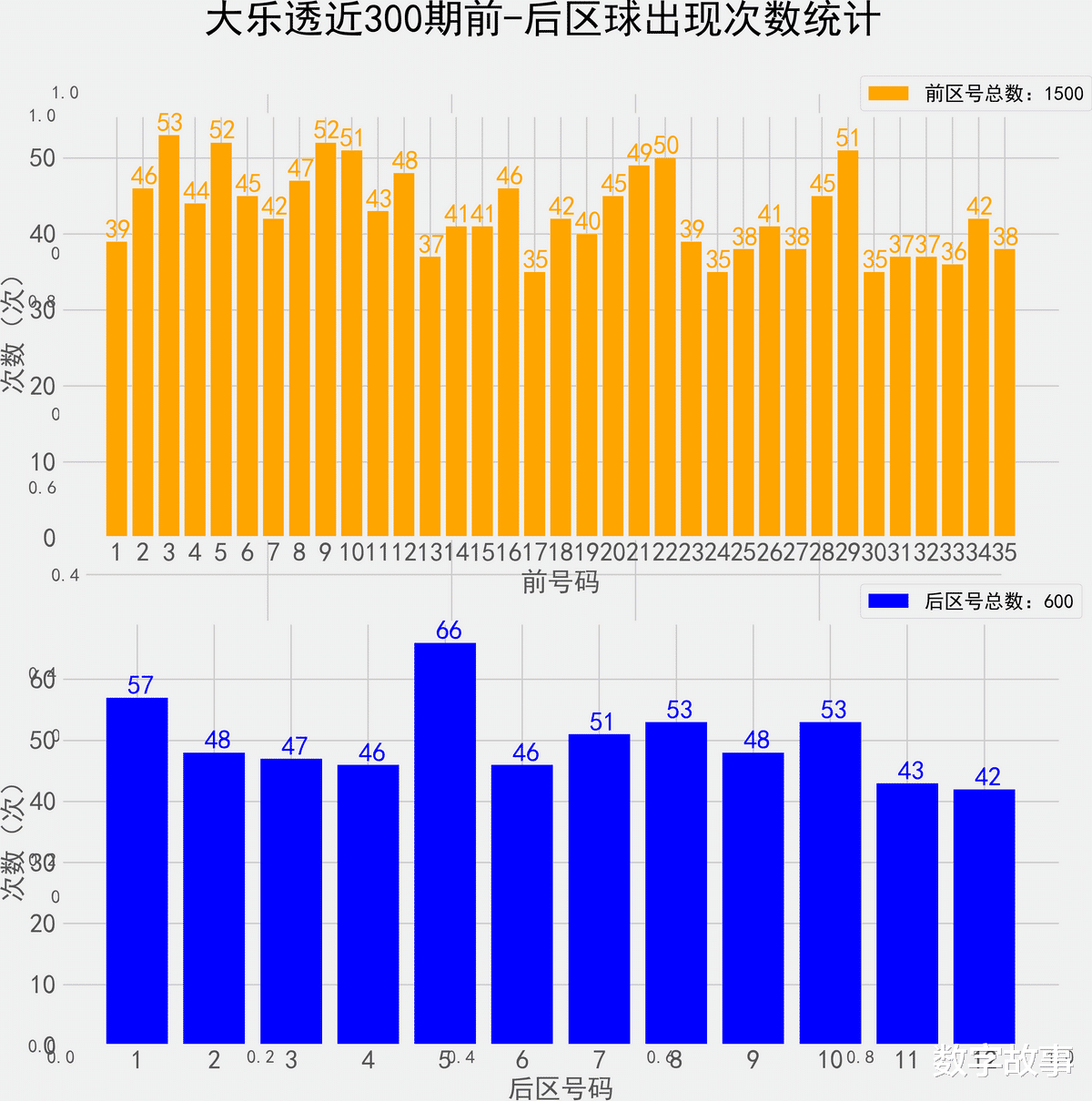 大乐透近300期前后区号统计情况统计样本数据: 1500个前区号码 600个后区号码
