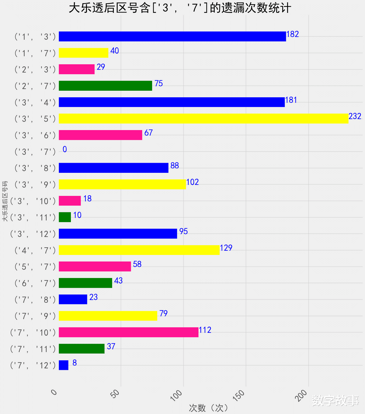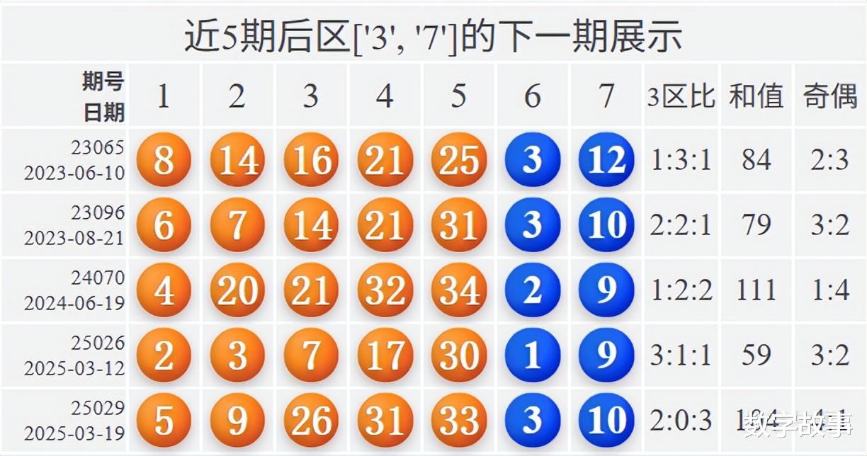 大乐透后区含3或7的双号遗漏次数统计大乐透后区组合3-7近150期出了2次,这次中断了146期遗漏。