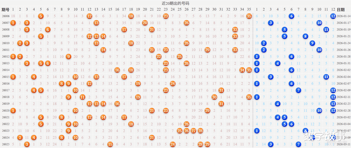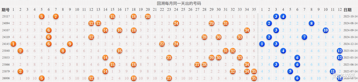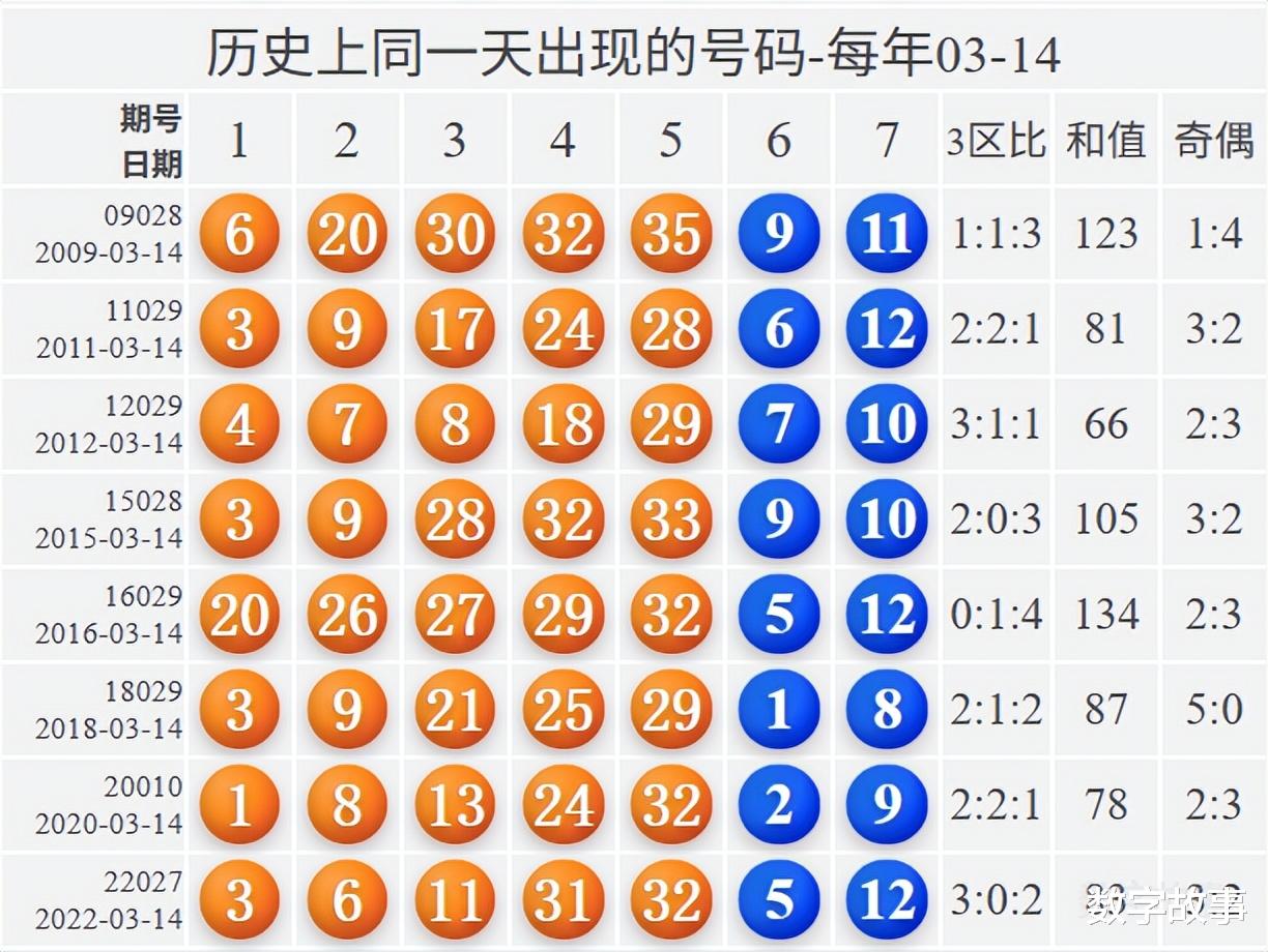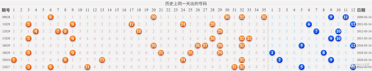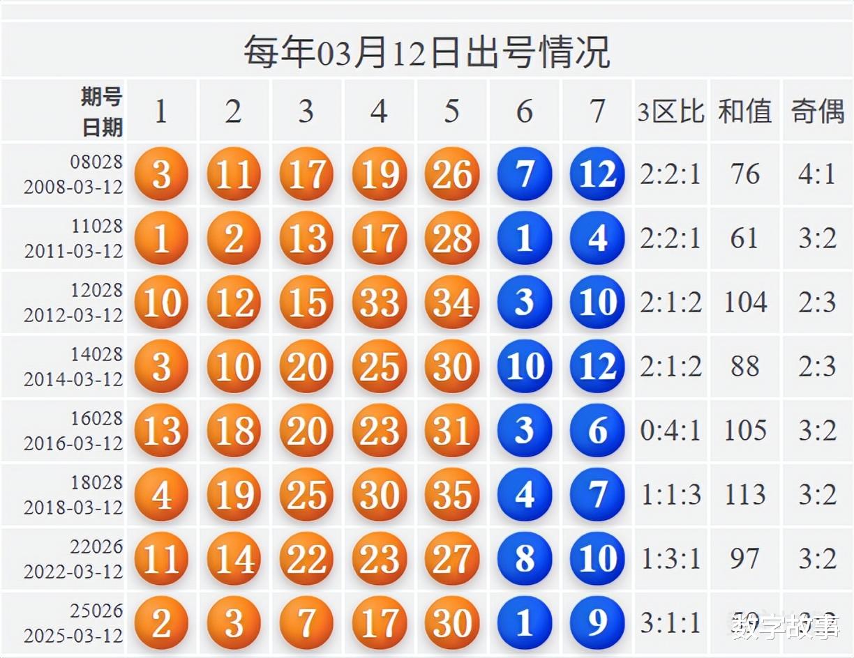 【其他历史数据查询统计】大乐透历史上的今天2026-03-12 星期四 大乐透不开奖每年03月12日出号情况:
