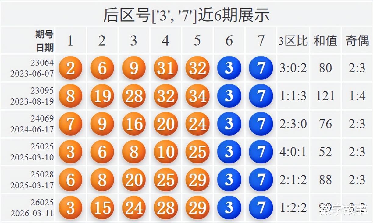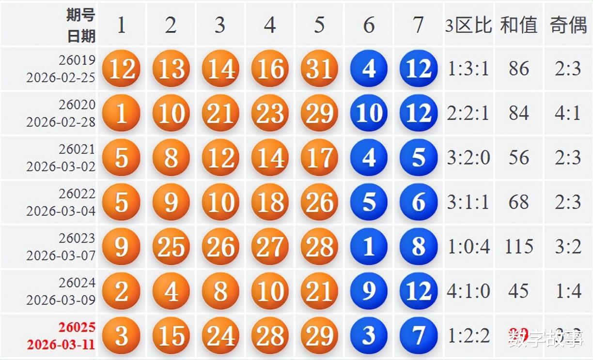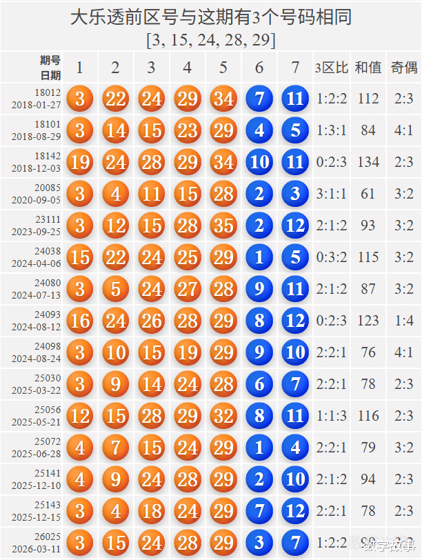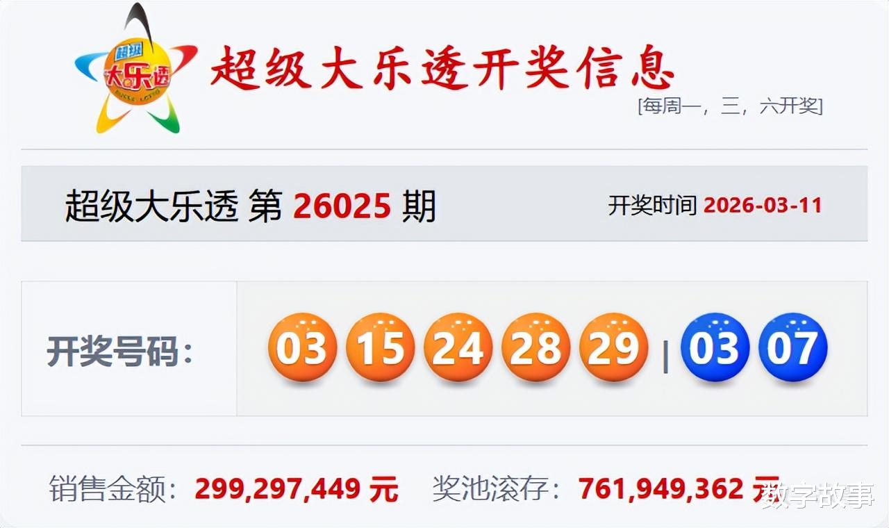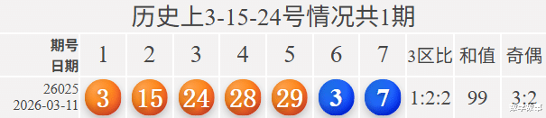 文末有大乐透前区号3-15-24, 24-28-29的历史统计。【体彩大乐透26025期开奖结果及统计】前区号和值99,后区3-7中断146期遗漏;10注一等奖,奖池7.619亿。大乐透26025期开奖结果及中奖情况:出奖时间: 2026-03-11 星期三 前区号:3-15-24-28-29后区号:3-7大乐透前区隔期下落:28前区奇偶比:3:2 前区和值:99前区跨度:26 三区比:1:2:2连号: 28-29