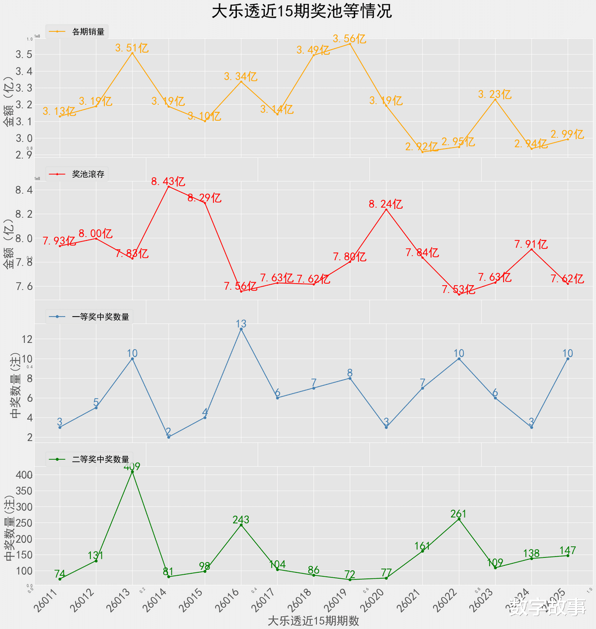 大乐透26025期一等奖:10注,追加: 2注二等奖:147注,追加: 38注。本期全国销售金额:2.993 亿 奖池滚存:7.619 亿.近15期奖池滚存, 中奖情况等信息: