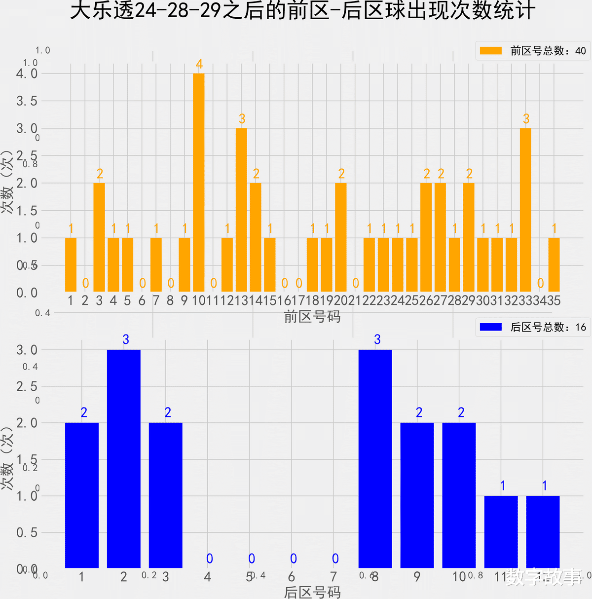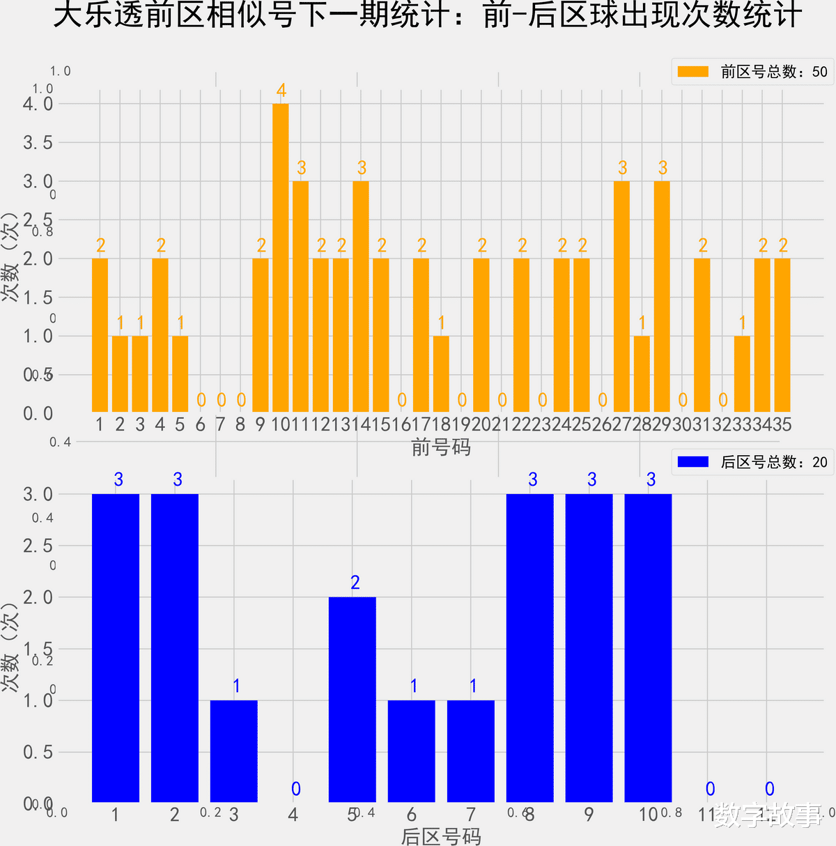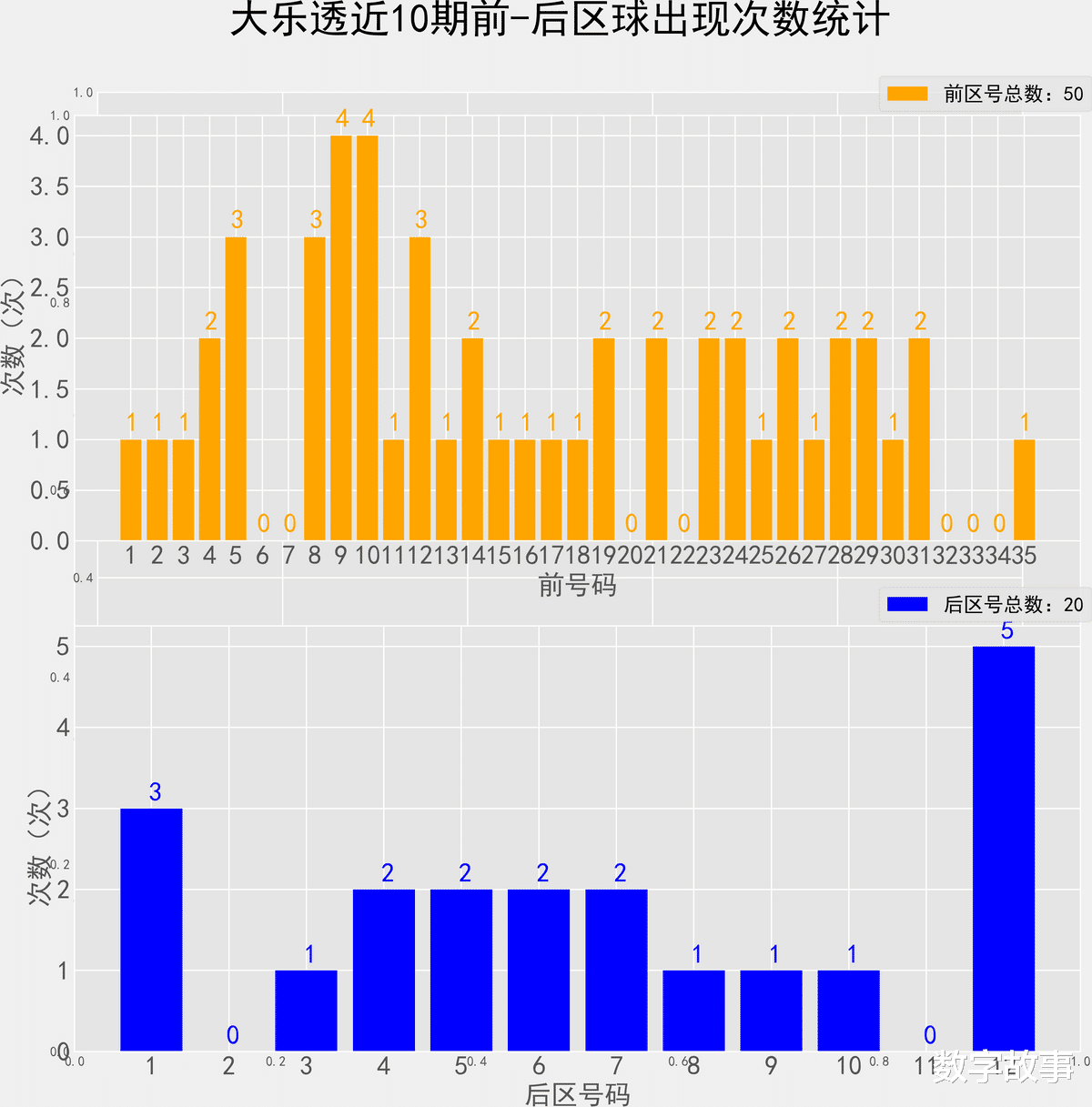 大乐透近10期前后区号统计情况统计样本数据: 50个前区号码 20个后区号码