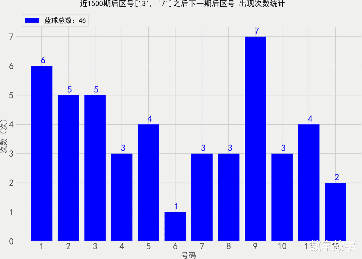 统计近1500期后区号3-7之后, 各后区号的出现次数大乐透26025期后区号是3-7找出近1500期后区3-7号之后,下一期出现的所有后区号,统计其出现次数。除开这一期,共出现了23次3-7后区号那么统计的样本数据是46个