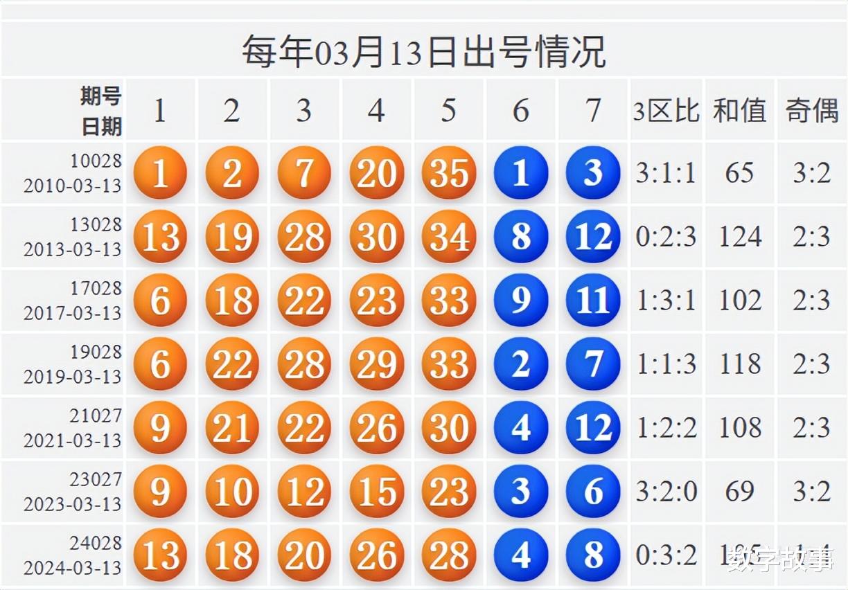 大乐透历史上的今天2026-03-13 星期五 大乐透不开奖每年03月13日出号情况: