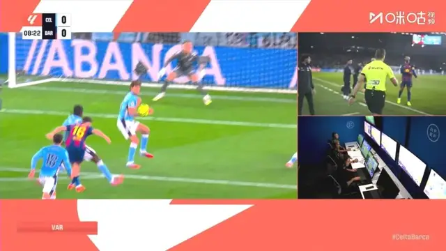 第8分钟,费尔明远射造成阿隆索禁区内手球,VAR介入后裁判员判罚点球,莱万主罚命中,巴萨1-0领先。
