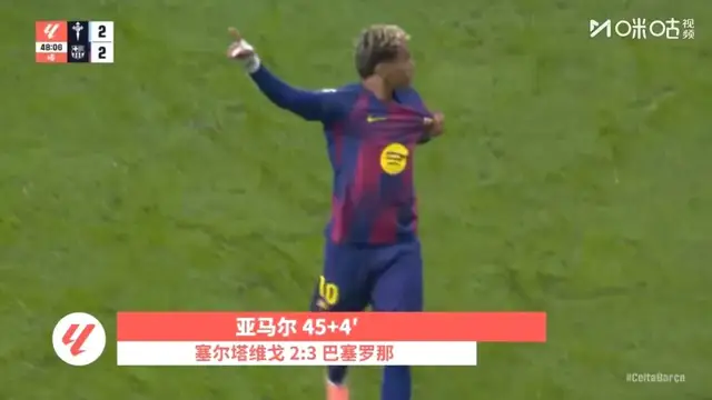 第45+4分钟,巴萨左路进攻,拉什福德横扫禁区,皮球被挡了一下,亚马尔跟进破门,巴萨3-2再次领先。