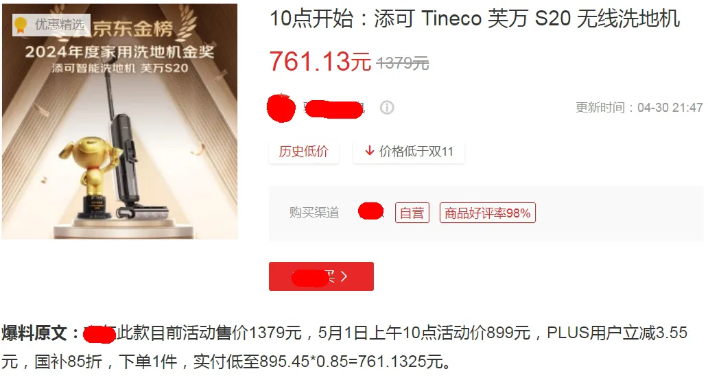 它的型号是添可芙万S20,狗东原价1379元,5月1日上午10点开始限时特价899元,叠加国补后最低761.13元,相当于打了5.5折。在去年双十一,添可芙万S(上一代)洗地机最低做到594.15元,这牌子经常会有这种极低价格,我建议逮特价买,千万别买首发。