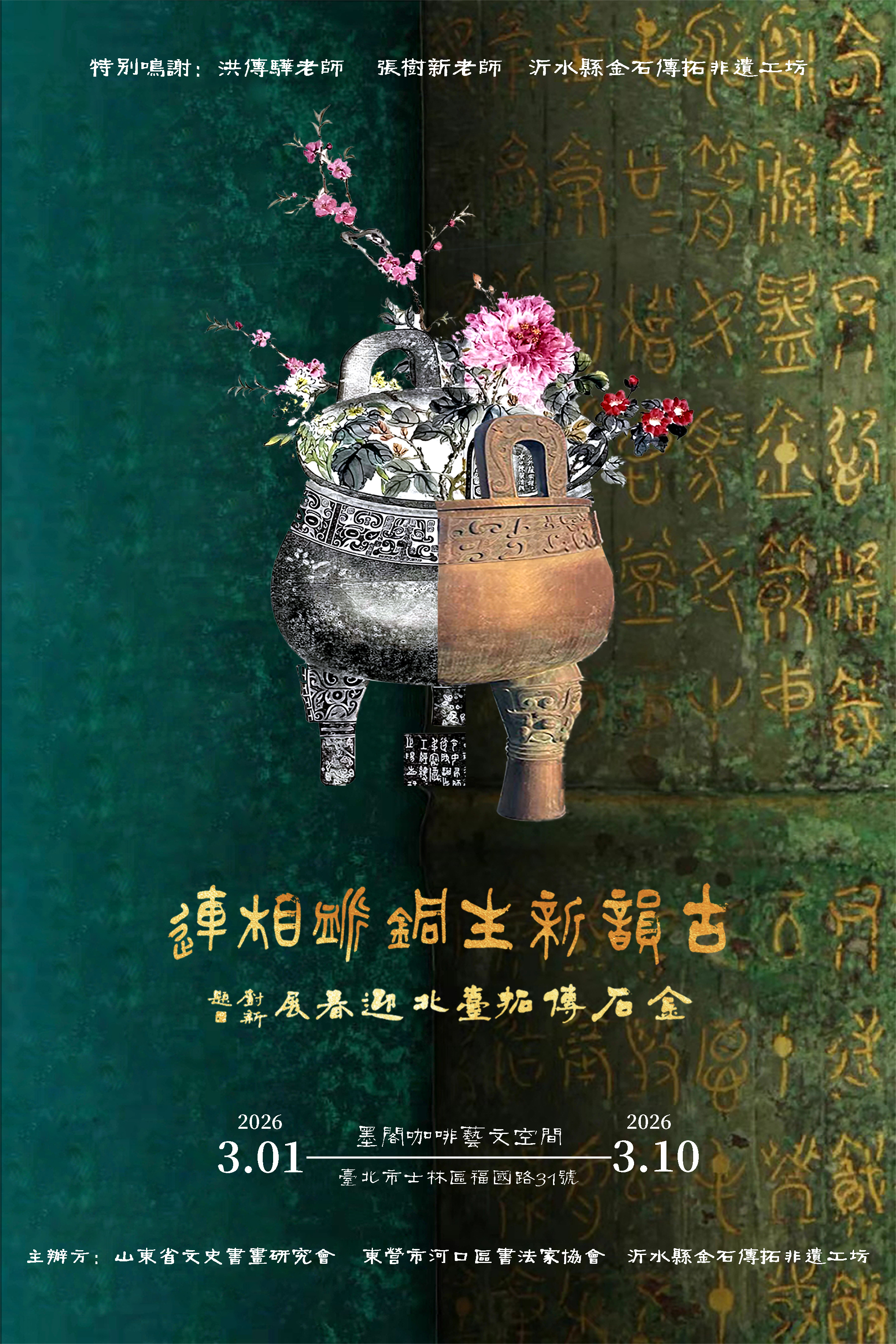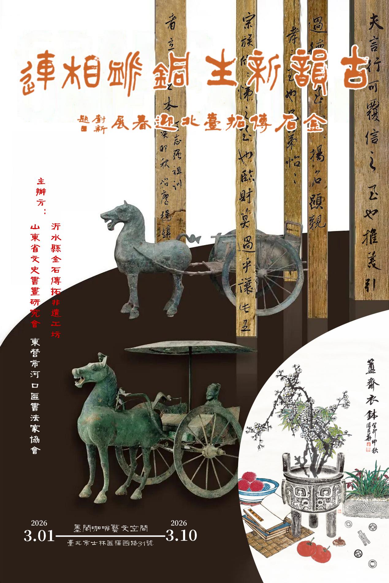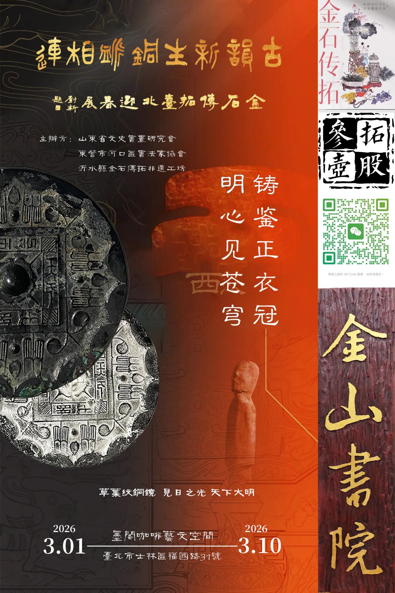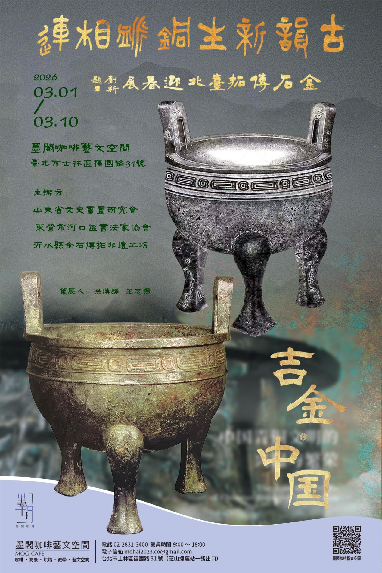 岁序更新,春归宝岛。古韵新生·铜脉相连 金石传拓台北迎春展于2026年3月1日至10日,在中国台北墨阁咖啡艺文空间正式举办。以青铜为根、以传拓为媒、以新春为序,在台北展开一场跨越千年的文明对话。展览将吉金重器的肃穆、传拓技艺的精微、当代审美的新意与两岸同文的深情熔于一炉,既是对中华金石文脉的致敬,亦是在新春时节,以艺术为桥,让文化根脉在海峡两岸同频共振。