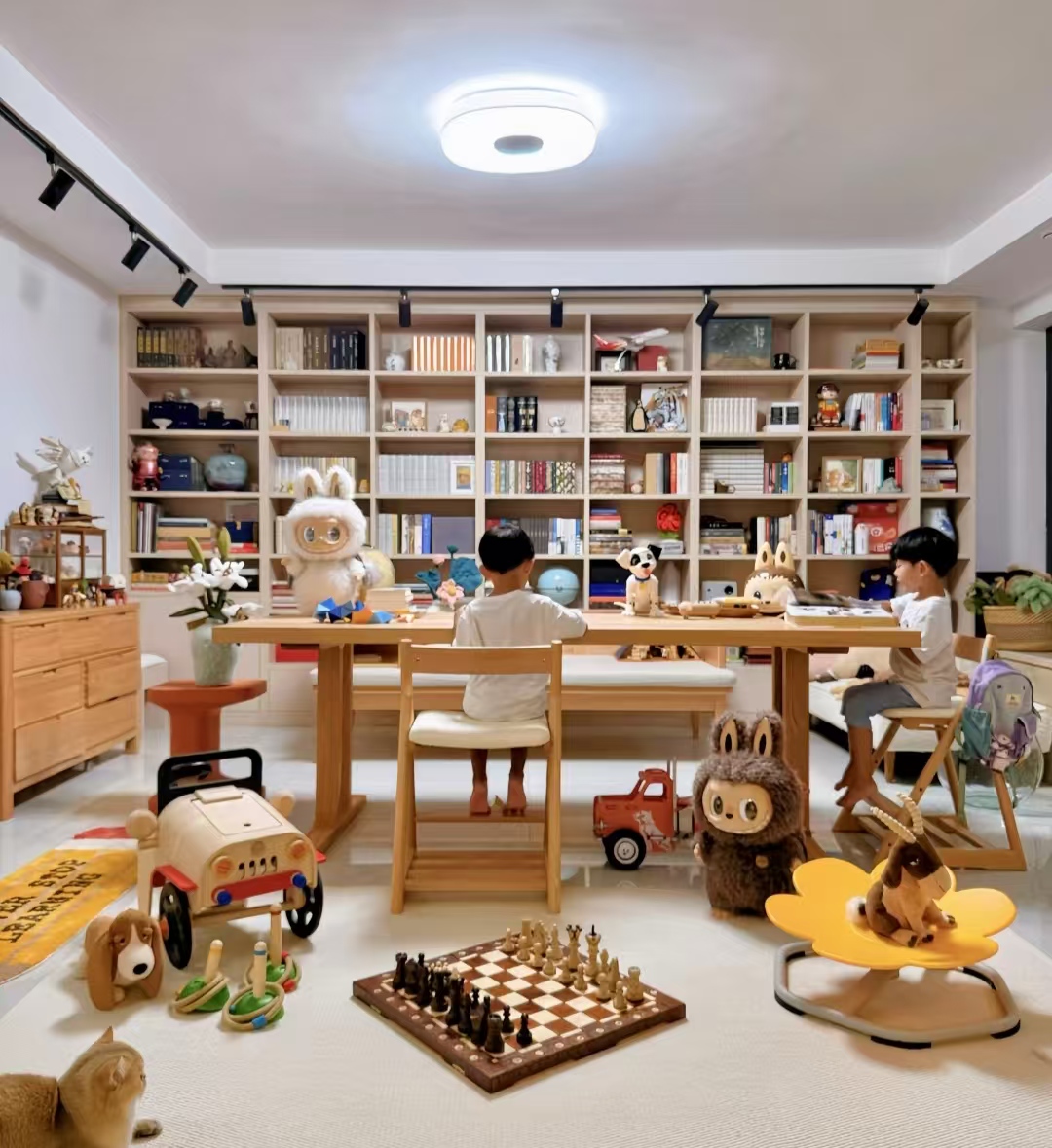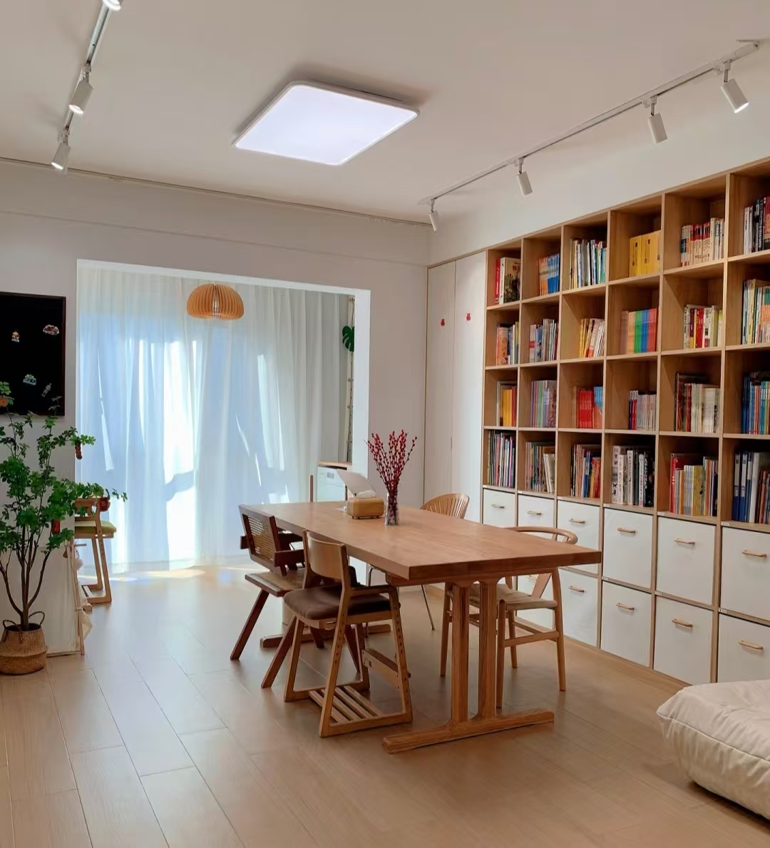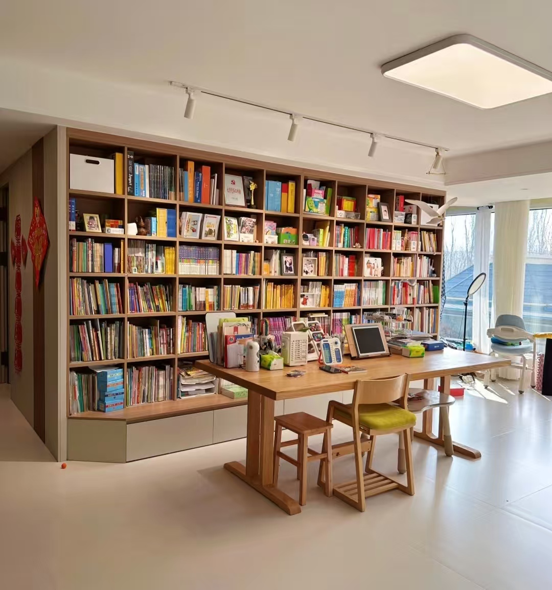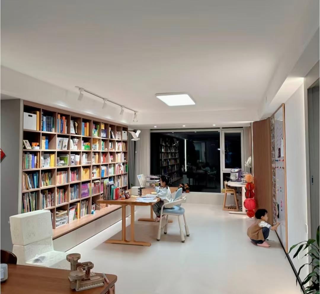 网友@粉红色的回忆说,我家是三年前装修的,那时候孩子刚上一年级,想着客厅坐一排书柜、放个大书桌,更方便陪伴孩子学习。