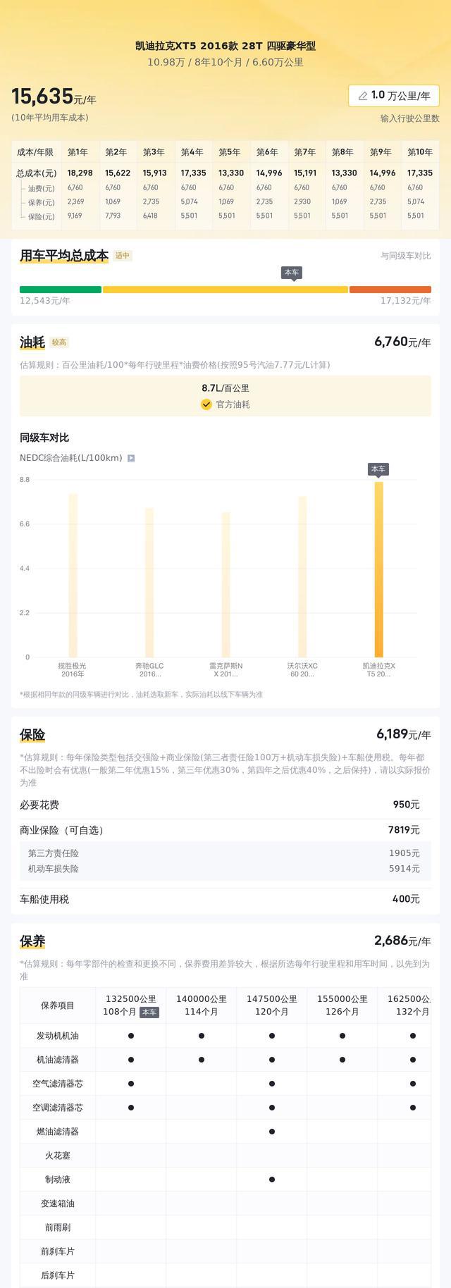 在使用成本方面,可能是许多消费者心中最顾虑的因素之一。根据计算,这款XT5的百公里油耗为8.7L,若按每年行驶2万公里来估算,每年的油费大约为14566元。而车险及保养等费用合计下来,年均用车成本在2.4万元左右。从这样的数据来看,XT5的用车成本相对合理,尤其在豪华SUV中显得颇具竞争力。