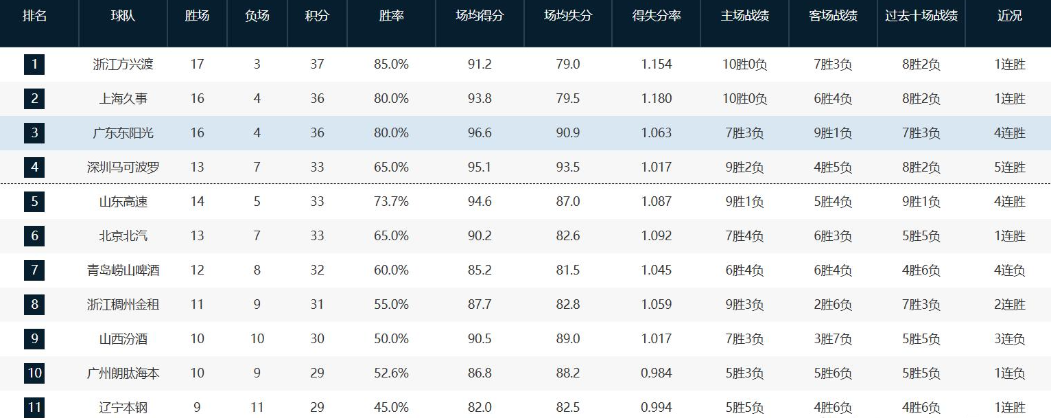 此外,本轮其余三场比赛结果如下:南京98:97险胜新疆。浙江稠州89:69战胜江苏男篮,赢得较为轻松;山东男篮99:75击败宁波。