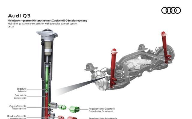 不仅仅是经济性,舒适性同样是全新奥迪Q3的一大亮点。人们随着生活水平提高,越来越重视在行车过程中所获得的舒适体验。为此,奥迪在全新Q3的底盘调校及座舱设计上不遗余力。新车配备的双阀减震器自适应悬架,能够实时根据路况调整阻尼,兼顾运动性和舒适性。比如在经过颠簸路段时,系统会自动软化滤震,提高车内乘坐的舒适性,而在弯道时则更注重侧向支撑,确保驾驶的稳定性。