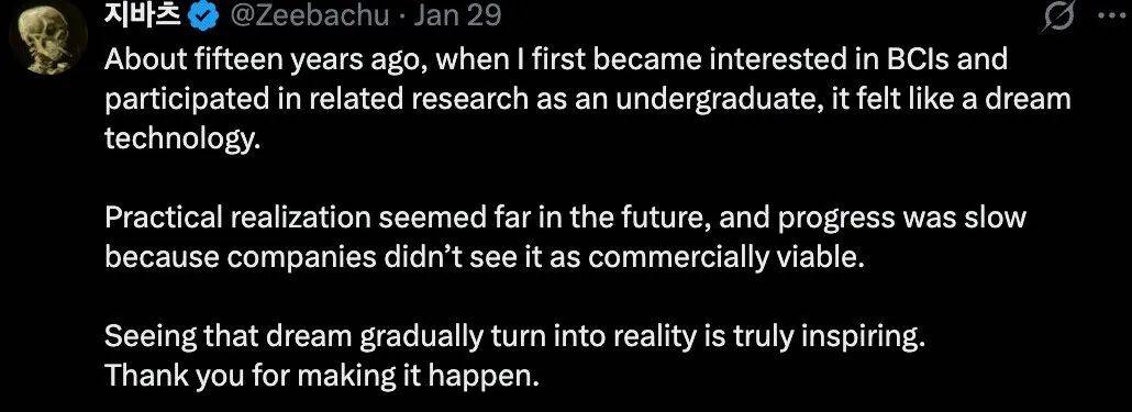 有网友评论称,大约十五年前,他还是本科生时,第一次对脑机接口(BCI)产生兴趣并参与相关研究,当时他觉得这就像一种梦幻般的科技,实际落地似乎遥遥无期,进展也非常缓慢,因为当时的公司并不认为它具有商业可行性。如今看到这个梦想一点点变成现实,真是令人振奋。