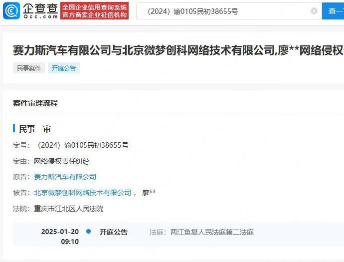 企查查 APP 显示,赛力斯汽车有限公司与廖某某等的网络侵权责任纠纷开庭公告已发布,该案将于 2025 年 1 月 20 日在重庆市江北区人民法院审理。这一举措标志着赛力斯汽车在维护自身品牌形象和用户权益的道路上迈出了重要一步。