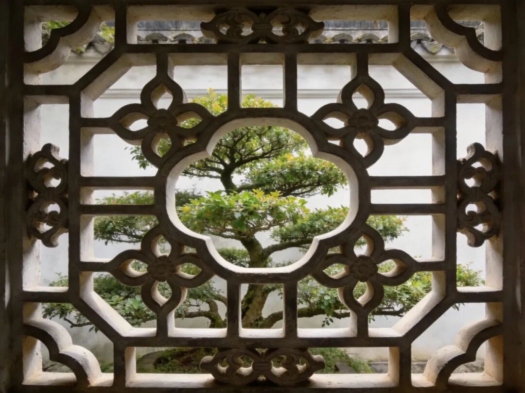 苏州园林漏窗细节,窗棂图案精美,透过漏窗可见园内花木