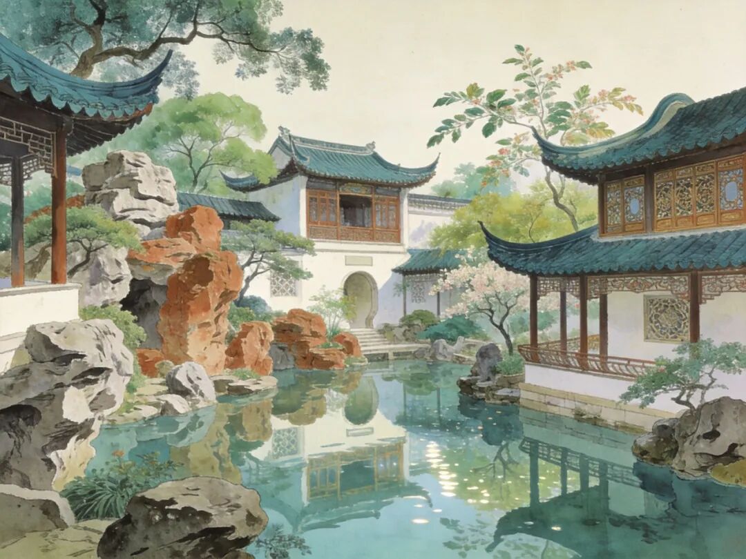 苏州园林全景,亭台楼阁、假山池水、花木掩映,宛如一幅立体的山水画