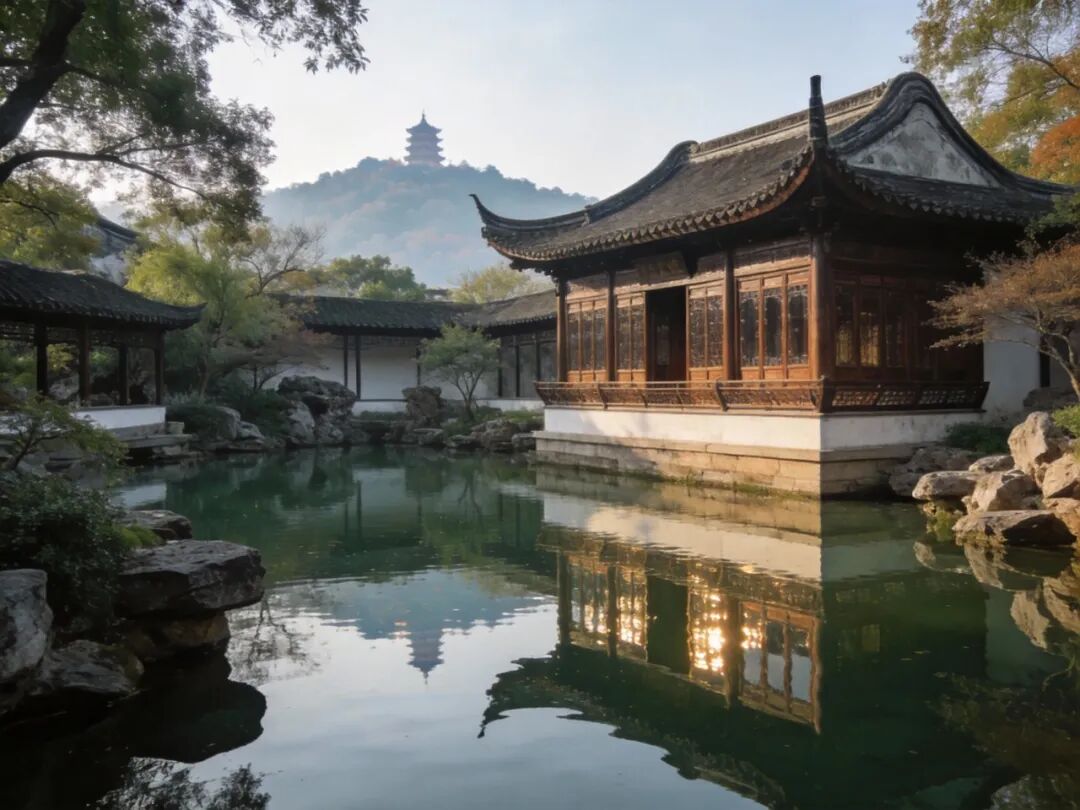 苏州拙政园见山楼,楼前池水清澈,远处天平山隐约可见