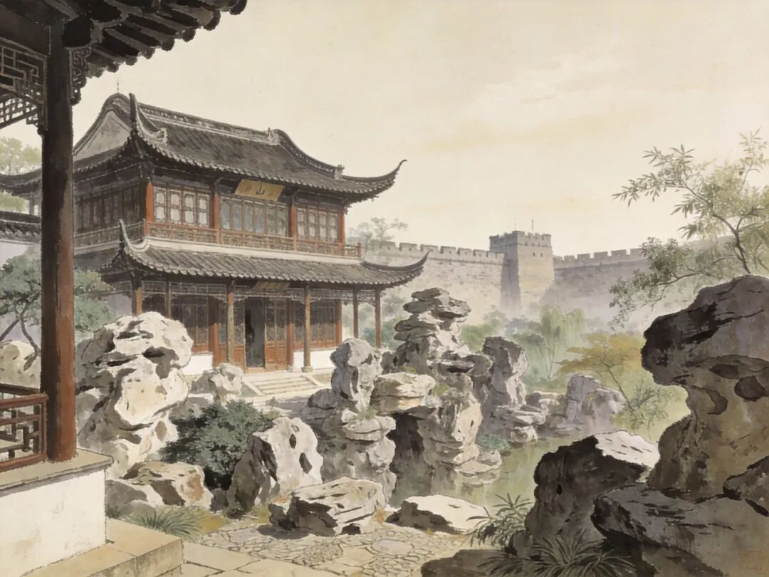 还有苏州的留园,它的西部有个「冠云峰」,本来就是个挺普通的太湖石,但造园家特意在它的对面修了个「可亭」,你站在可亭里看冠云峰,刚好能把远处的虎丘塔也框进画面里。这下好了,一块石头、一座塔、一个亭子,瞬间就组成了一幅层次分明的山水画,这就是「远借」的魔力。