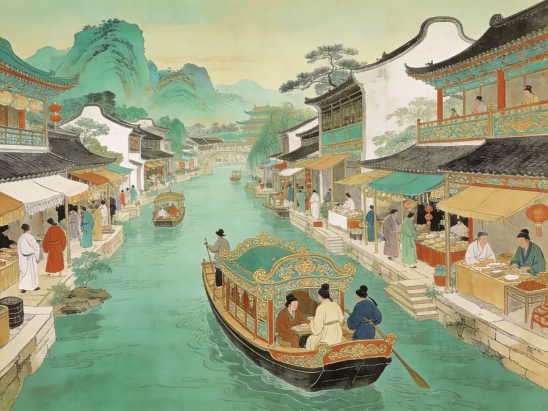 明代江南水乡繁华景象,河道两岸商铺林立,文人雅士乘舟出游