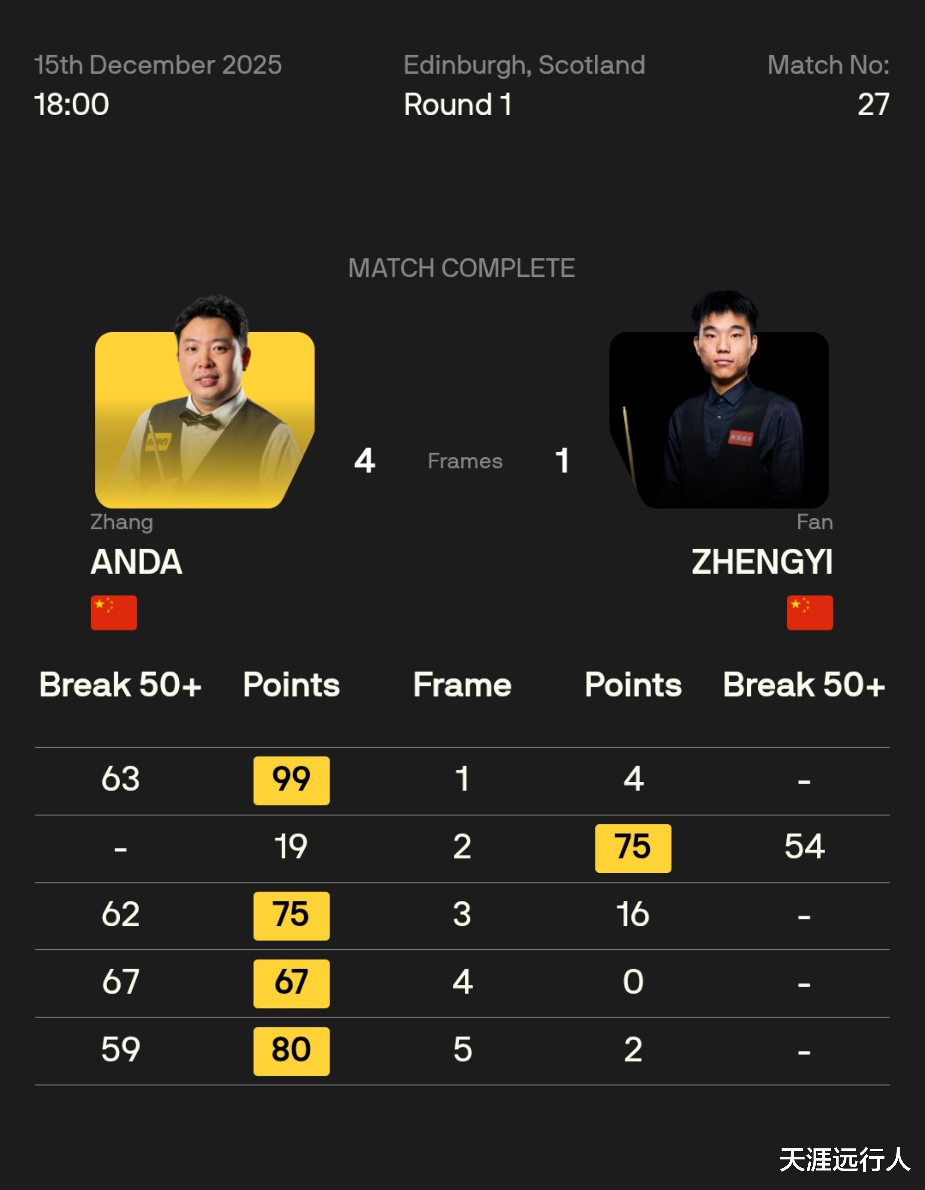 张安达单杆63,先声夺人,范争一回以单杆54扳平,达仔连打三杆59+,一波三连击带走比赛。
