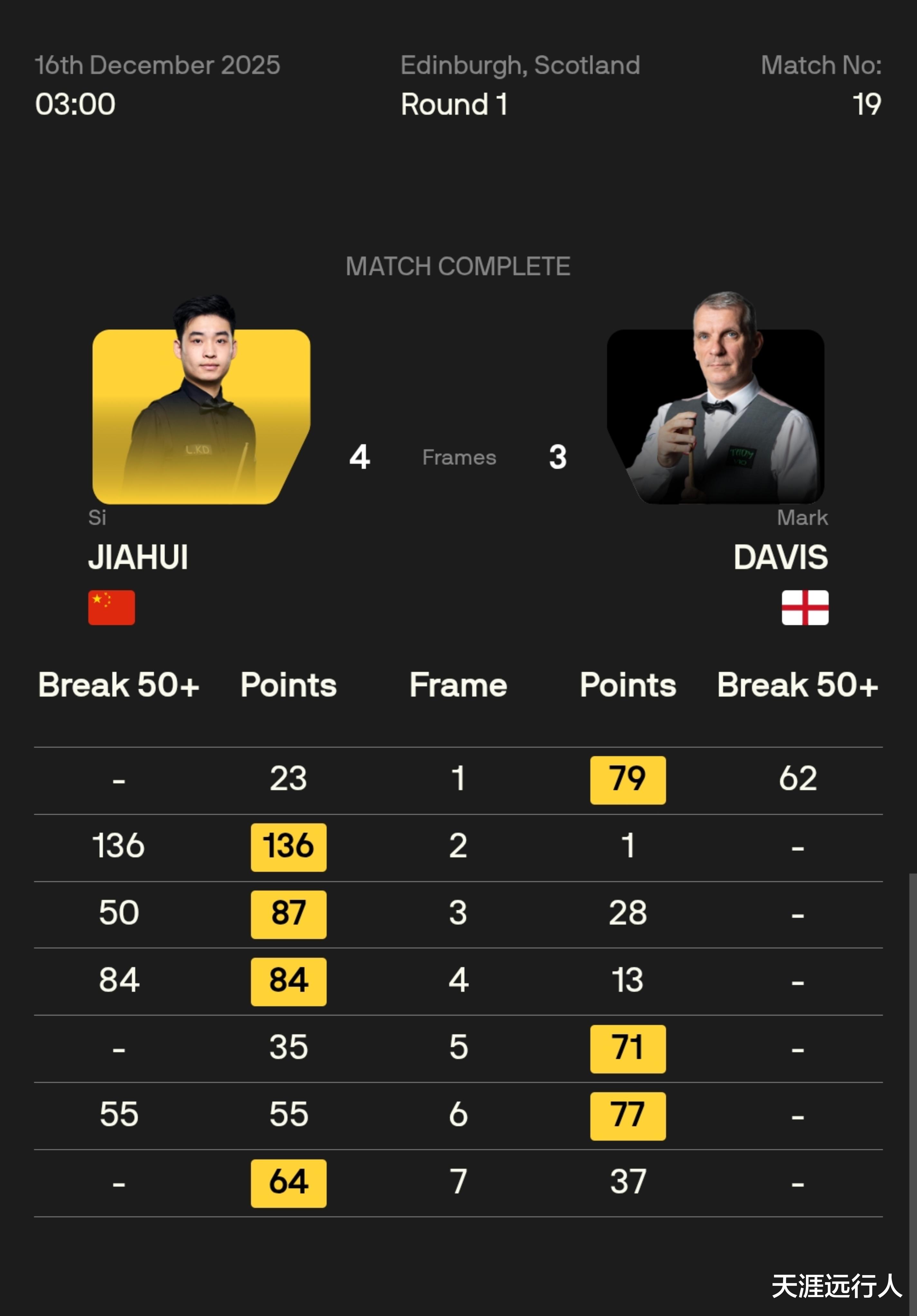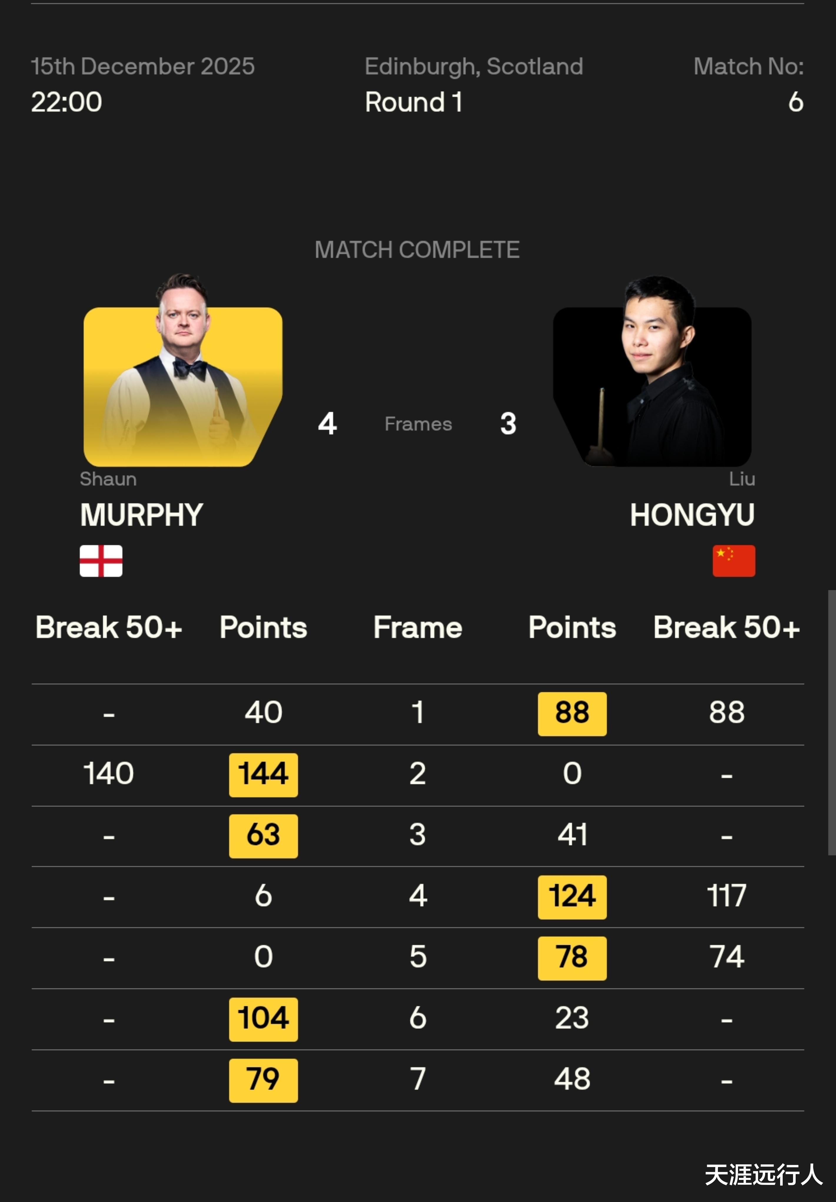 北京时间12月16日早8时01分,2025斯诺克苏格兰公开赛正赛64进32轮次,首个比赛日的13场角逐,全部决出了胜负,赛会32强产生17席。
